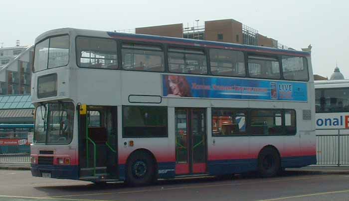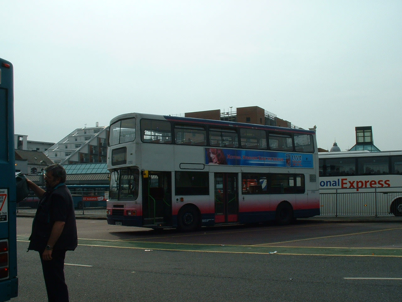 VA30/31776 (R930WOE) is also in Leeds Bus Station in April 2007. Notice how these buses have retained their dual doors and have a tailored electronic destination blind to fit into the standard London aperture.