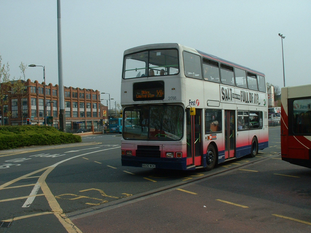 First Leeds 31808 (R936YOV) was new as London United VA36. In an unusual purchase, First acquired these second hand buses for use in Yorkshire, the bus is seen in Leeds in April 2007.