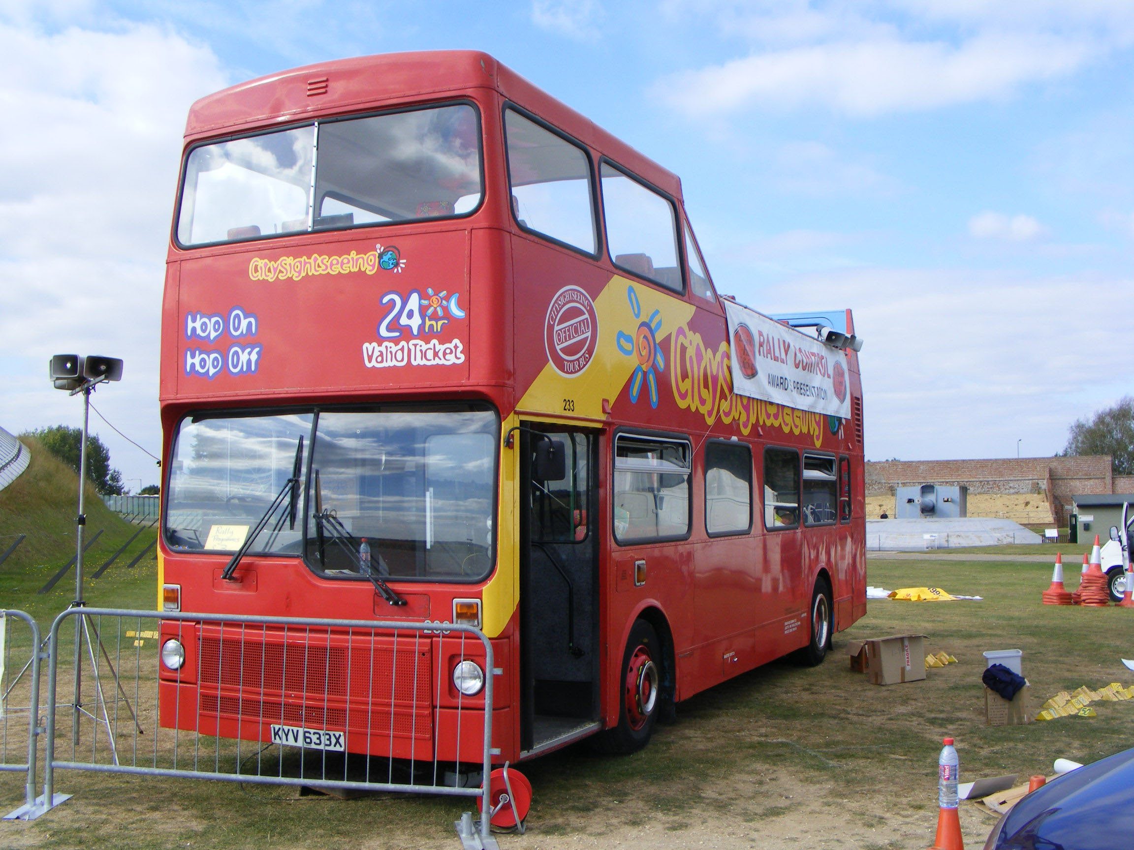 For many years Ensignbus has extended its support to SHOWBUS by providing one of its many open-toppers from its worldwide City Sightseeing fleet for use as SHOWBUS Rally Control. Former London MCW Metrobus M633 (KYX633X) is the regular choice. The bus is believed to have been used on the former Harrods London Tour and as such has some useful table arrangements in the sheltered part of the top deck and a small kitchenette area downstairs. The bus is seen on the Saturday as the whole site is being prepared for SHOWBUS 2009.