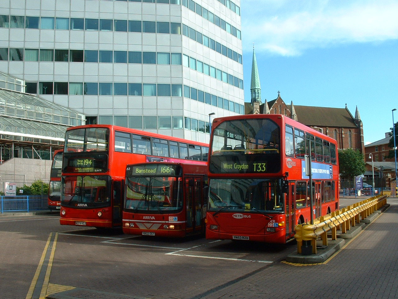 Alongside a pair of Arriva DAFs in West Croydon bus station on June 22nd 2007 is Metrobus Scania/East Lancs 491 (YN53RZD). It will be noted that the bus has lost blue and yellow splashes in favour of Ken red.