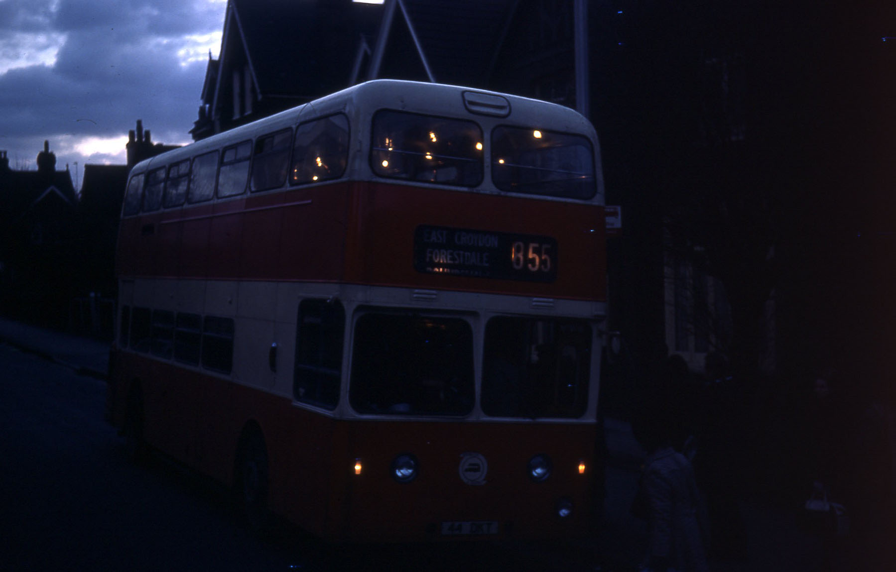 Former Maidstone & District lowbridge Weymann bodied Leyland Atlantean L44 (44DKT) served with Orpington & Ditrict, the fledging fleet that metamorphised into Go-Ahead's Metrobus subsidiary. Their pioneering 853 route needed a lowbridge bus, but they also utilised minibuses. The bus is seen at twilight. |