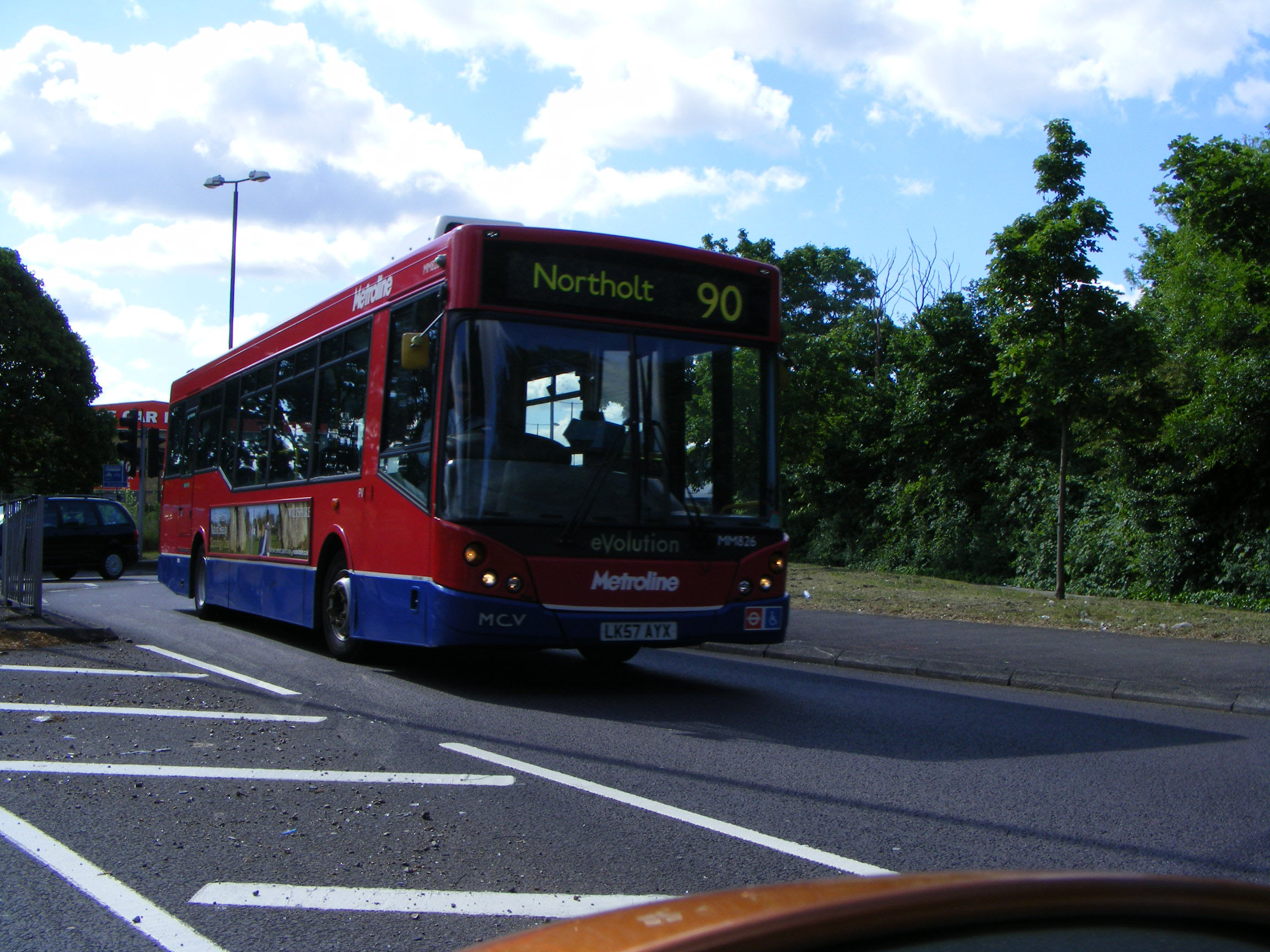 At work on the 190 circumnavigating the Heathrow perimeter road in May 2011 is MCV Evolution bodied MAN 12.240 MM826 (LK57AYX).