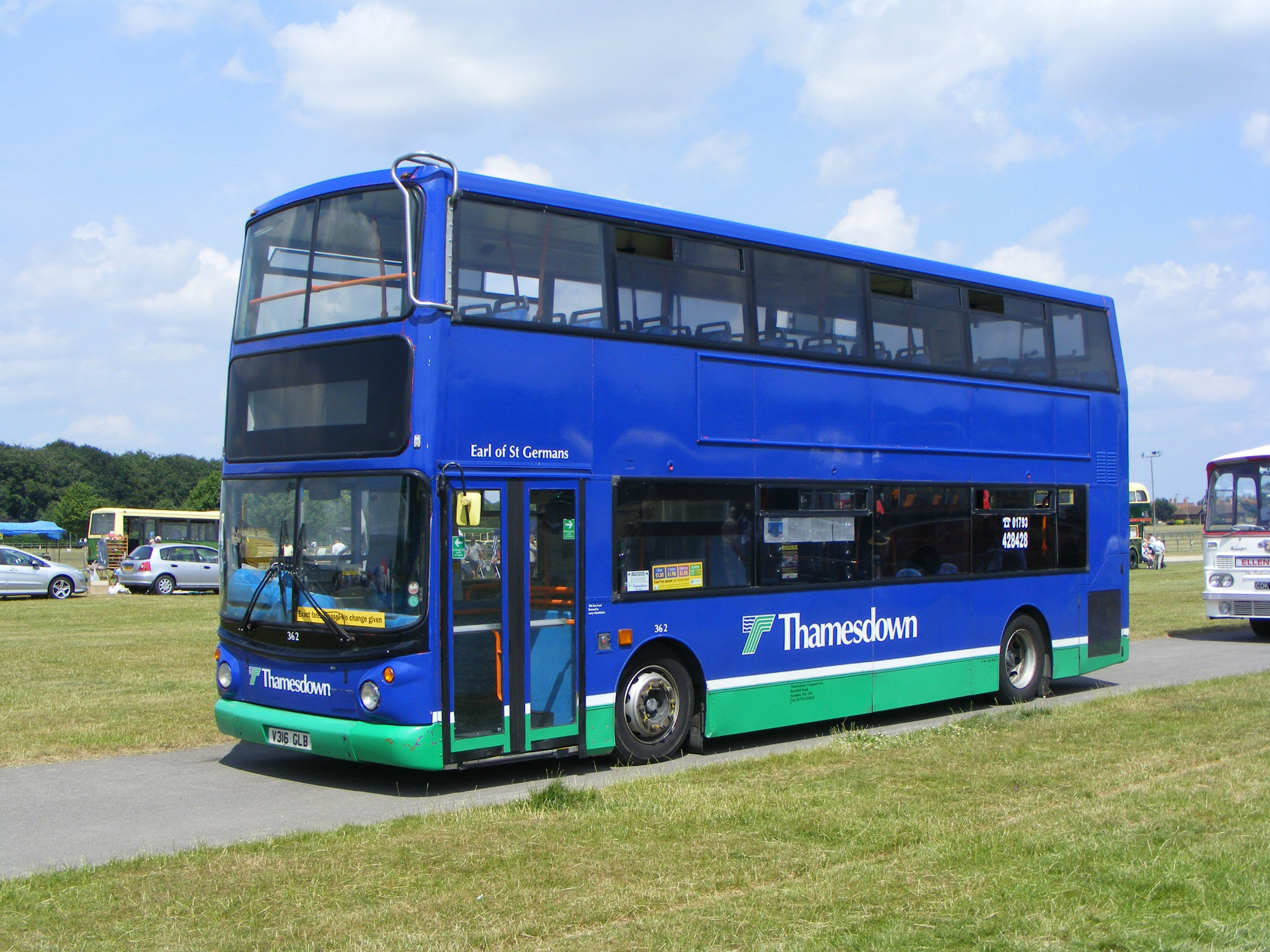 Smartly turned out in Thamesdown's livery is Alexander ALX400 bodied Dennis Trident 362 (V316GLB), former TA115. The bus is seen at the Newbury Showground Bus Rally in July 2013. |