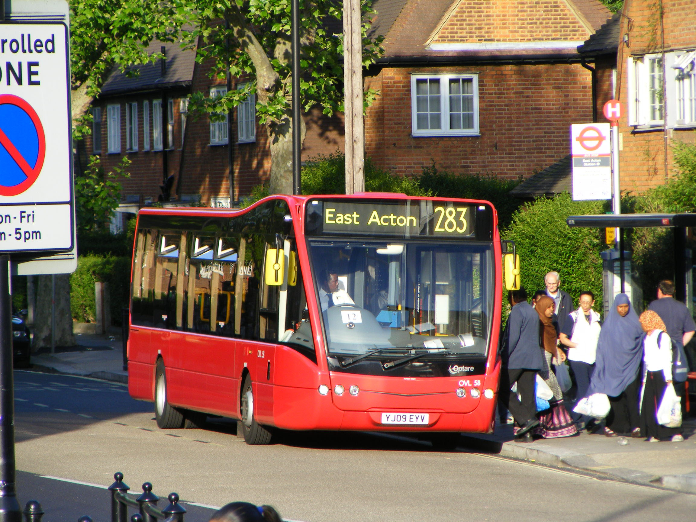 The operation abandoned Alexander Dennis for Optare when they obtained the contract for the 283. A fleet of Versa models entered service in 2009 and OVL58 (YJ09EYV) is seen near East Acton Station that May.