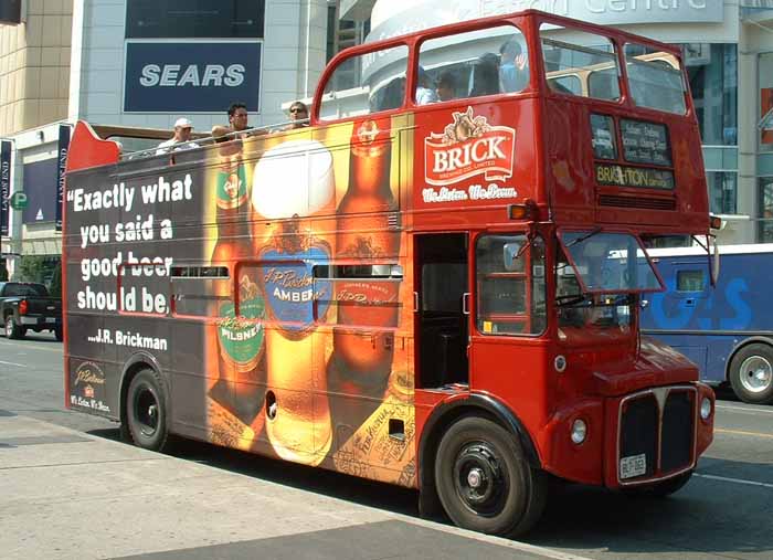 RMLs pass on the tour in downtown Montreal. RML2749 is seen from the top deck of another Routemaster. Note that "749" is lettered "Montreal Sightseeing" while "Tour de Ville" was used on 435 whilst others carried nothing. |