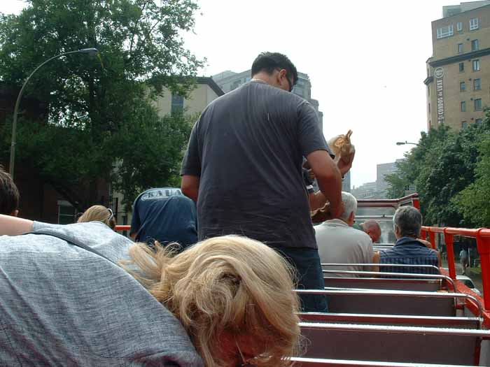 Unfortunately the weather in Montreal in July cannot be relied upon. As the tour bus returned at speed from the Olympic site it started to rain and raindrops at 40 mph can be quite painful. At traffic lights the driver sounded the siren to give passengers - under supervision of the guide - to descend into the dry. A bit further on and the sun came back out, the bus stopped and the driver, equipped with a roll of paper towels dispensed them to passengers returning to the top deck so they could dry their seats. |