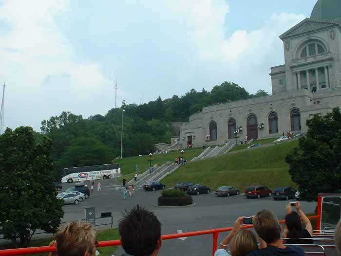 The city tour takes in Notre Dame Basilica, Chinatown, the Old Port of Montreal, Montreal Science Center, Montreal Casino, St Catherine Street shopping area, Mount Royal Park, Crescent Street's Hard Rock Cafe, Dorchester Square and this, the magnifcient St Joseph's Oratory. A Coach Canada MCI departs as photographers snap from the roof of the Routemaster. |