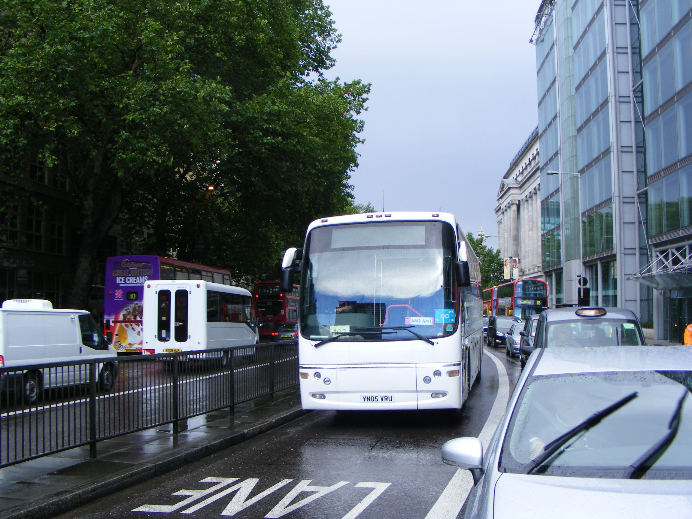 Bereft of named branding in July 2012 Plaxton Panther bodied Volvo B12B YN05VRU is seen speeding down one of the special Olympics bus lanes as it performs one of the many hotel shuttles for athletes and officials.