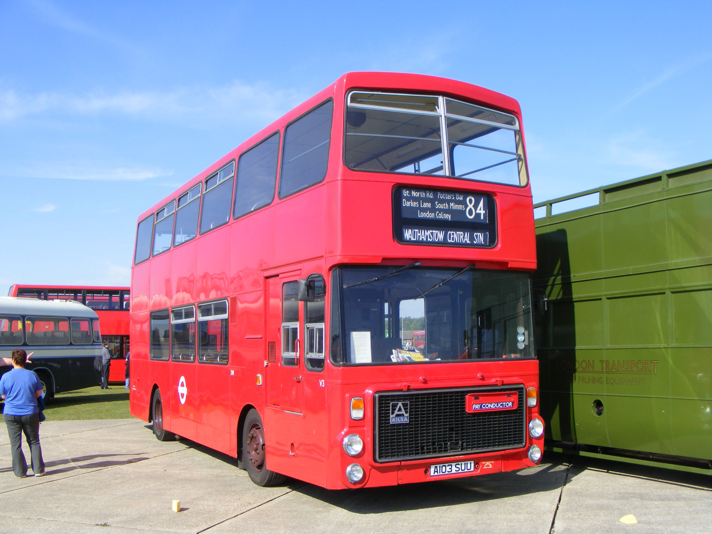Ailsa V3 (A103SUU) was the most interesting of all the experimental fleet. Advantage was taken of the Ailsa's front engine to produce a dual door version with the second pair of doors at the rear of the bus. The "Borismaster" was born ahead of its time. The bus ended its LT days with London Northern at Potters Bar, where it sustained roof damage and was sold to Black Prince of Morley. Black Prince repaired the bus and closed the rear platform and put it into service with its large Ailsa fleet. |