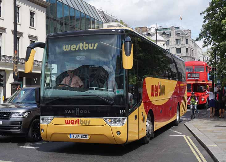 Following the Astromega purchases integral Van Hool singledeckers joined the fleet like 156 (YJ14BXD) seen outside Charing Cross Station and pursued by a heritage Routemaster on route 15 in August 2015.