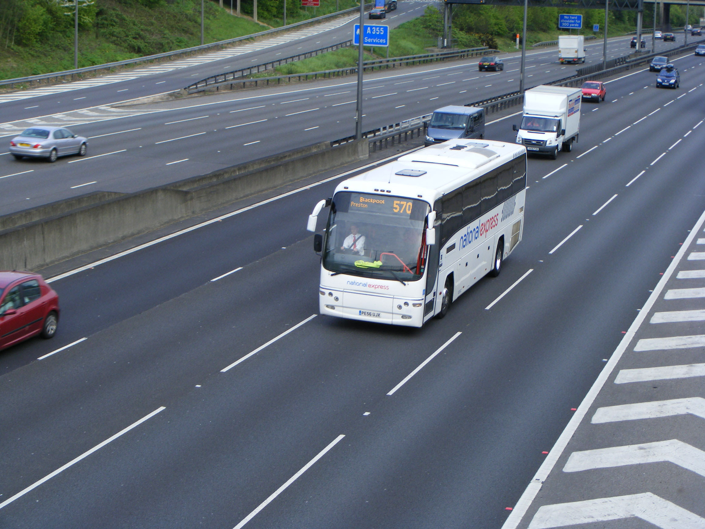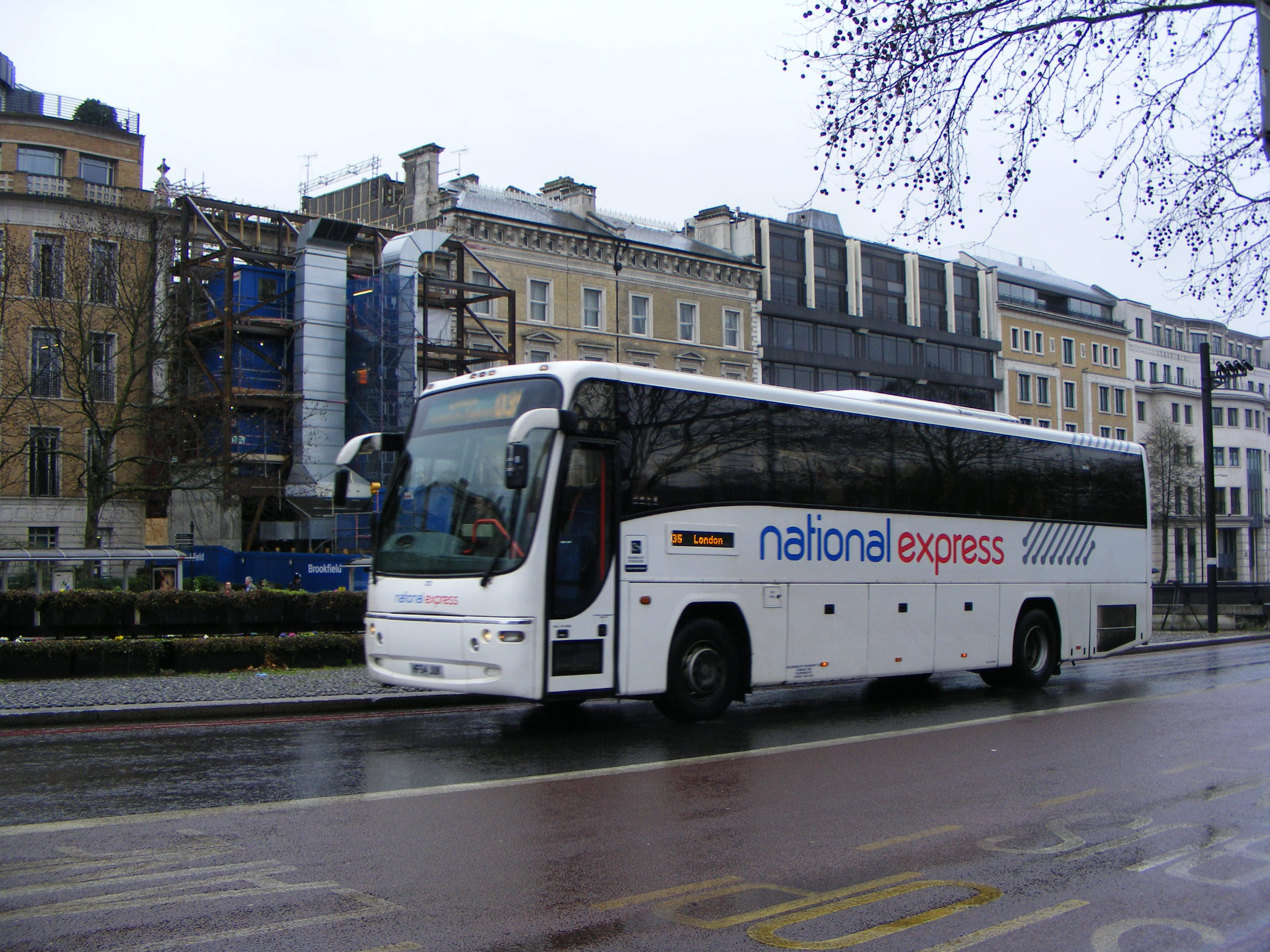 Six years on and Bournemouth was by then owned by RATP and still using its Plaxton Panther bodied 312-318 on National Express work. This is 313 (HF54JUK) in the new National Express livery. |