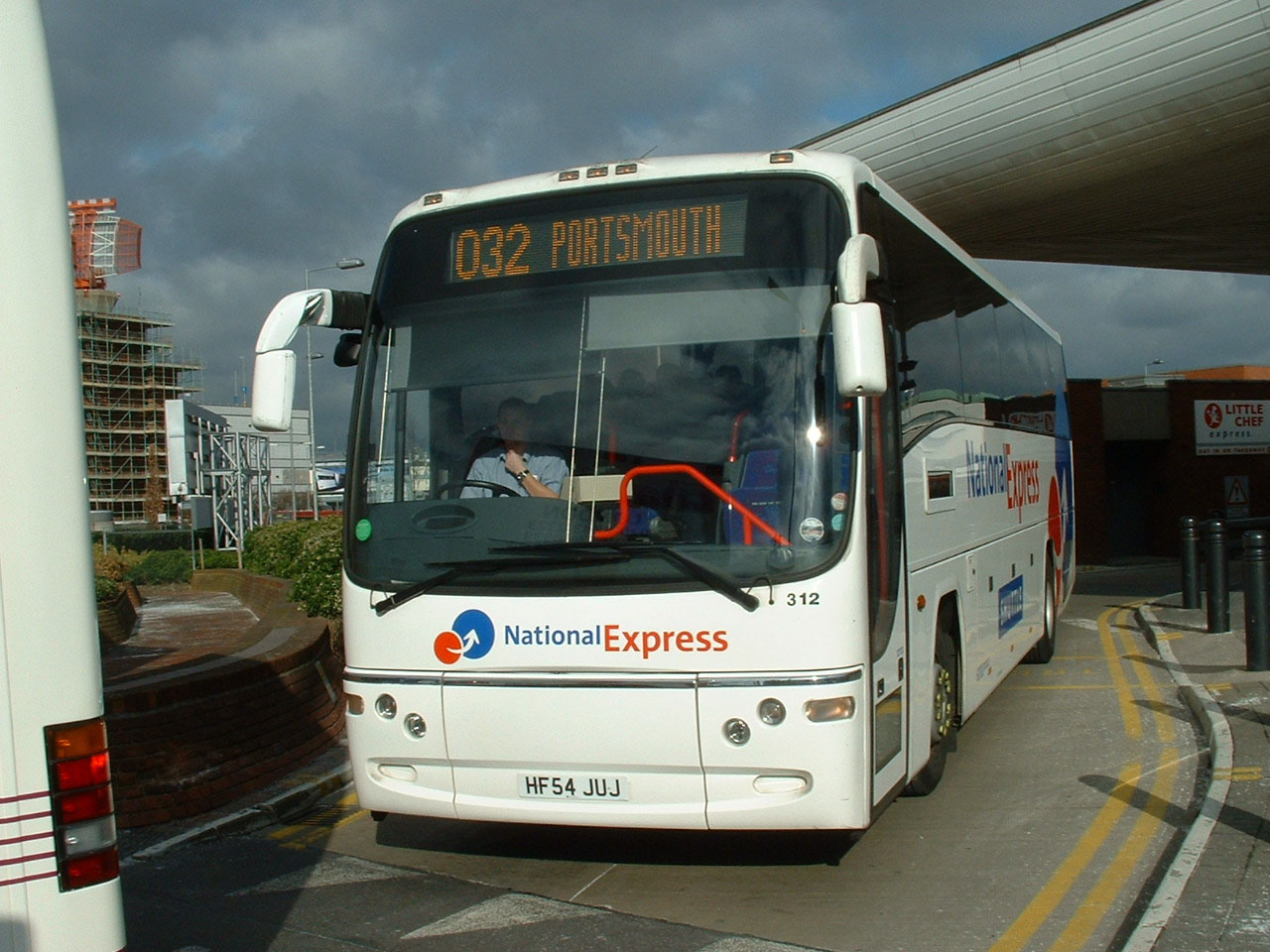 Bournemouth Yellow Coaches' 312 (HF54JUJ) is a Plaxton Paragon bodied Volvo B12B leaving Heathrow for Portsmouth in February 2005. |