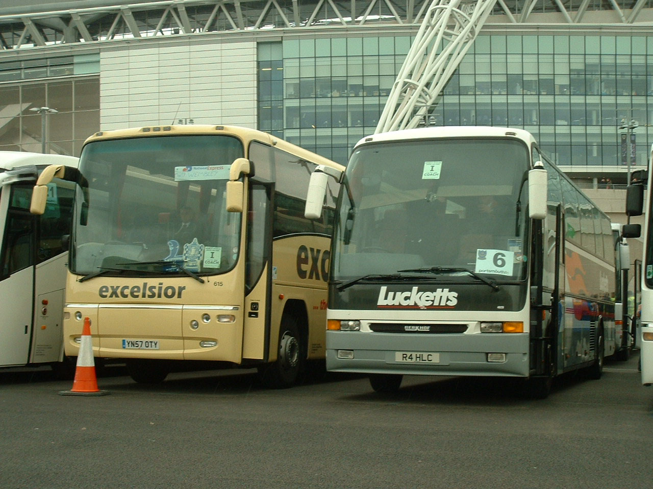 Alongside Luckett's Berkhof bodied Dennis Javelin, 4920 (R4HLC), is Excelsior's Plaxton bodied Volvo B12M 615 (YN57OTY) at Wembley Stadium. Both coaches were bringing south coast supporters for the FA Cup Final of 2008 between Portsmouth and Cardiff. |