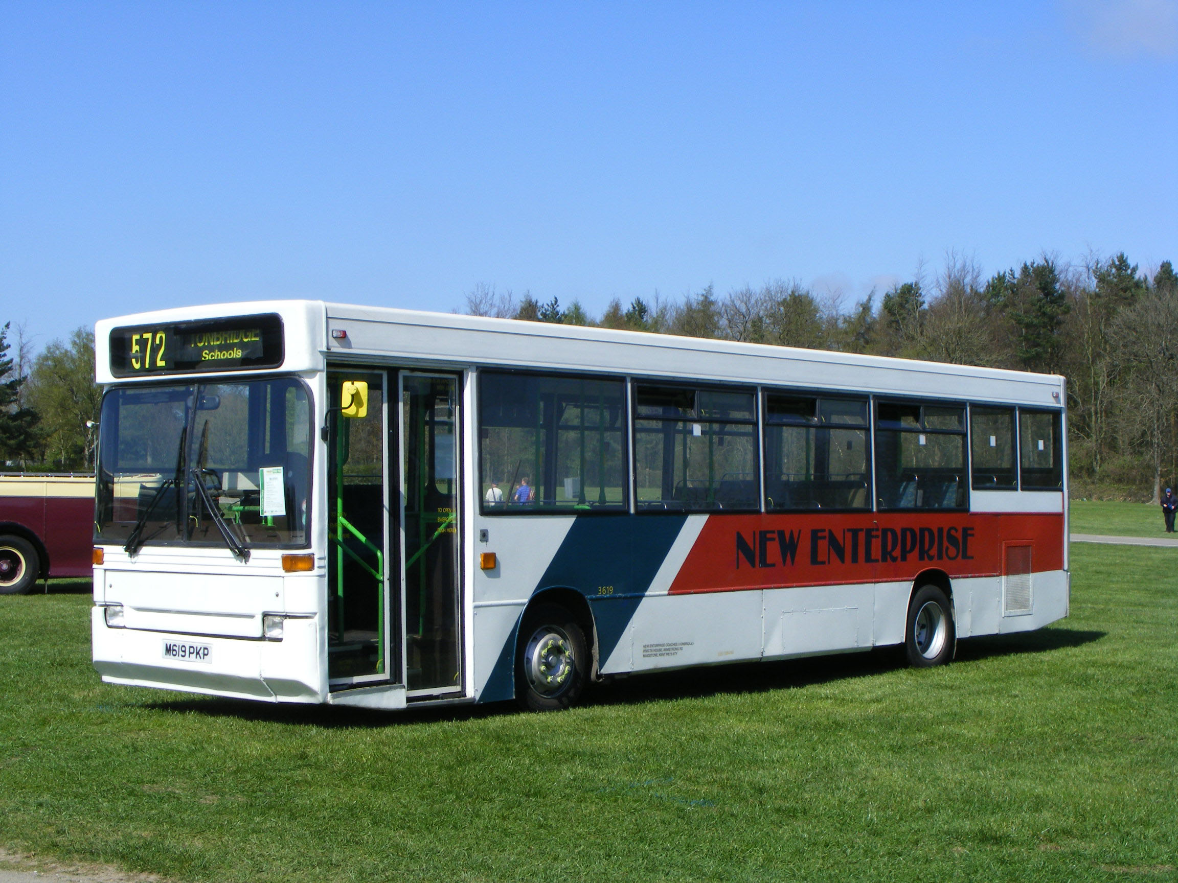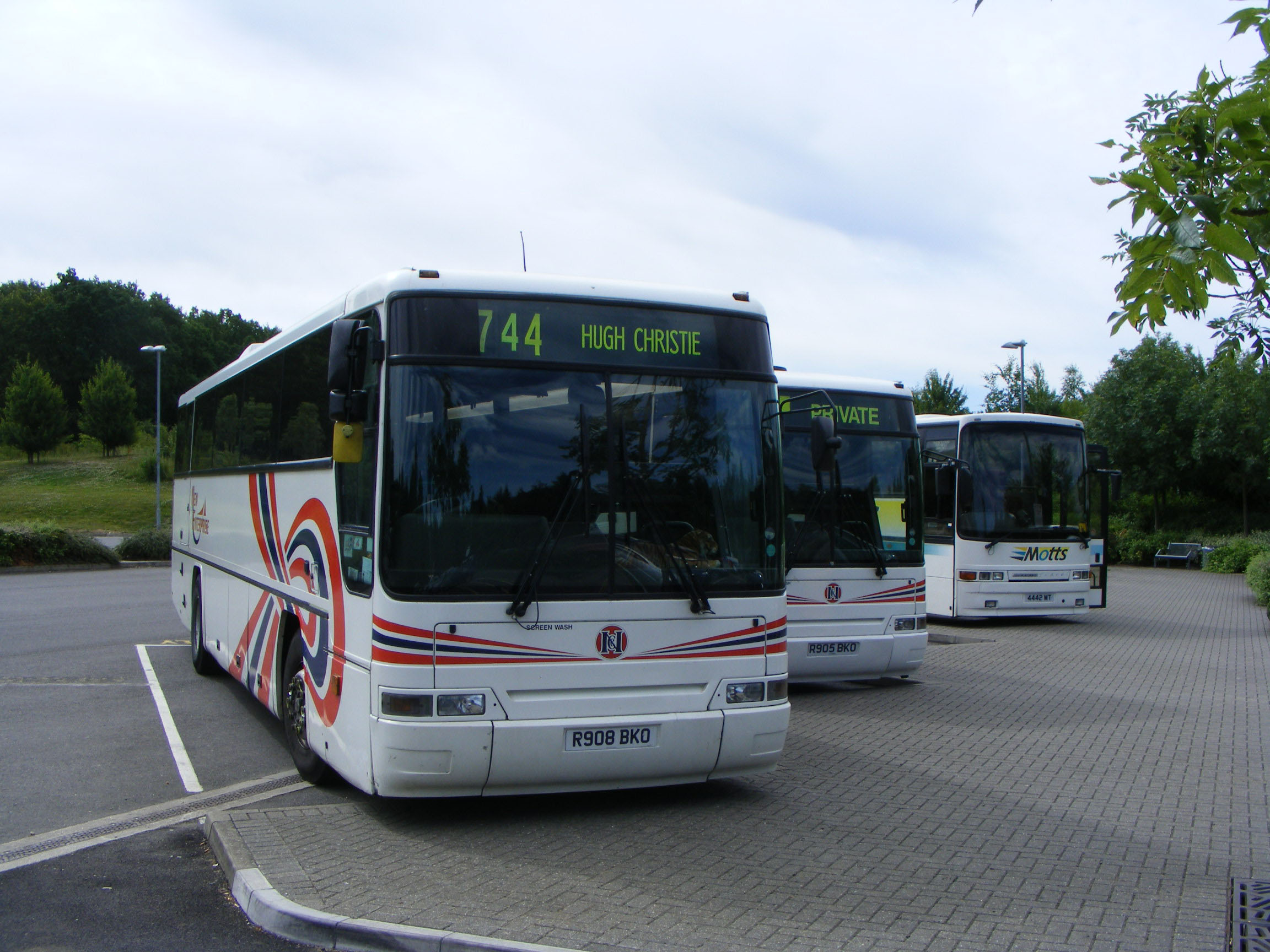 Two of the former Maidstone & District Plaxton bodied DAF SB3000 Green Line coaches are seen together in July 2010 with a Motts Travel Jonckeere bodied Volvo B10M, 4442MT. The New Enterprise coaches are 2908 (R908BKO), nearest the camera, and 2905 (R905BKO) in the middle. |