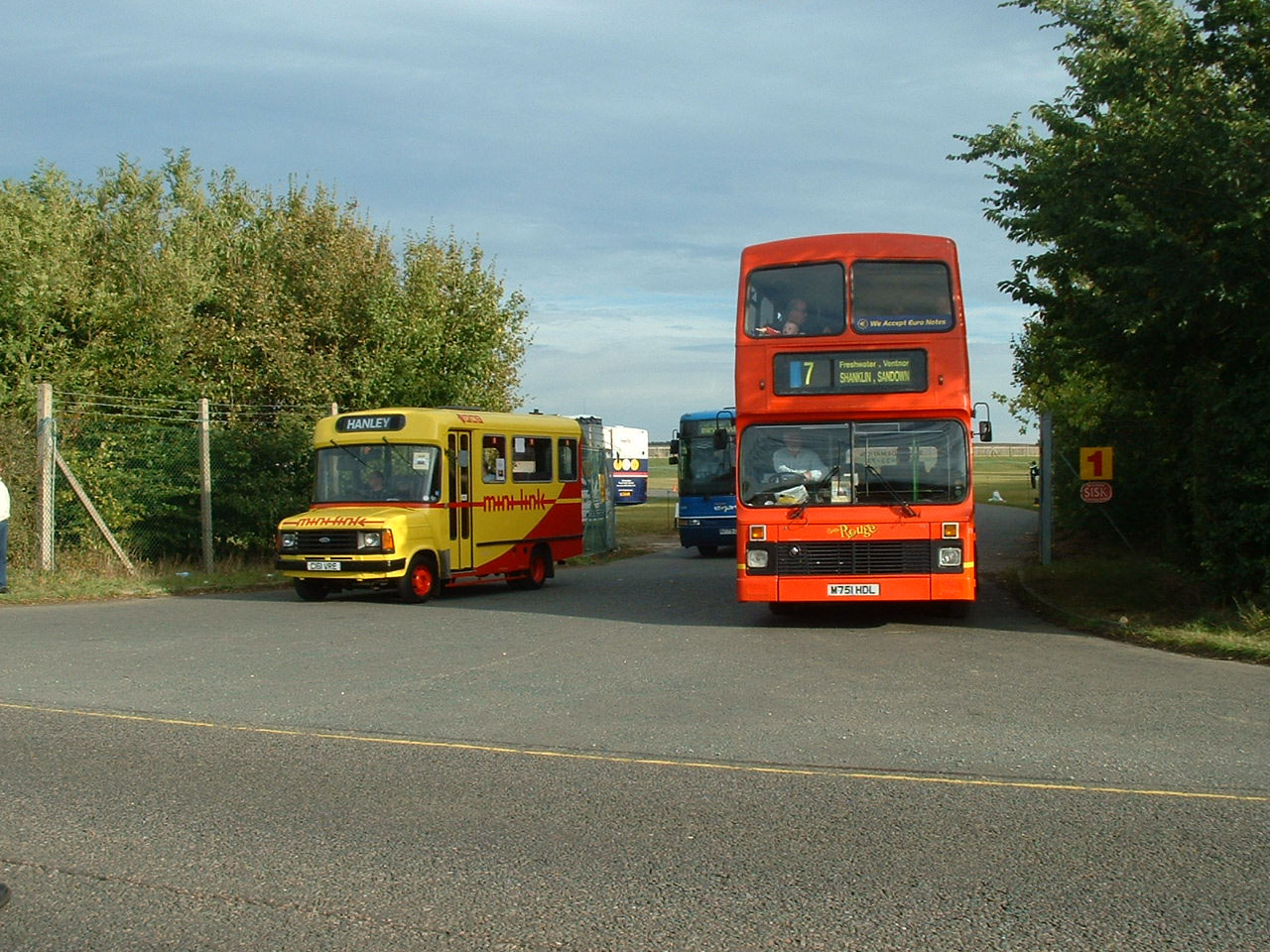 Leaving SHOWBUS international 2004 is Route Rouge Northern Counties bodied Volvo Olympian 751 (M751HDL) in company with a former PMT Ford Transit 161 (C161VRE). |