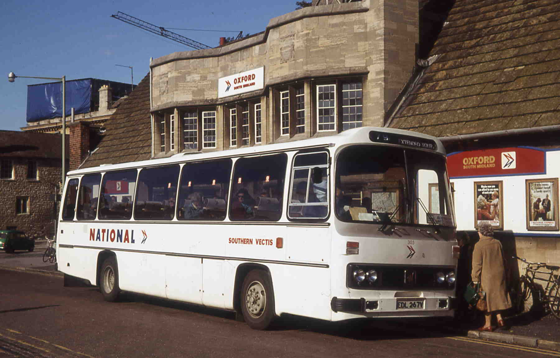 Undoubtedly a backward step in NBC days was the acquisition of a trio of Willowbrook bodied Bedford YMT coach es in 1980, of which this was the first, 305 (EDL267V). Oddly the next two with consecutive registrations were numbered 423 and 128 respectively. This coach appears to be on National Express duties in Oxford's Gloucester Green Coach Station.