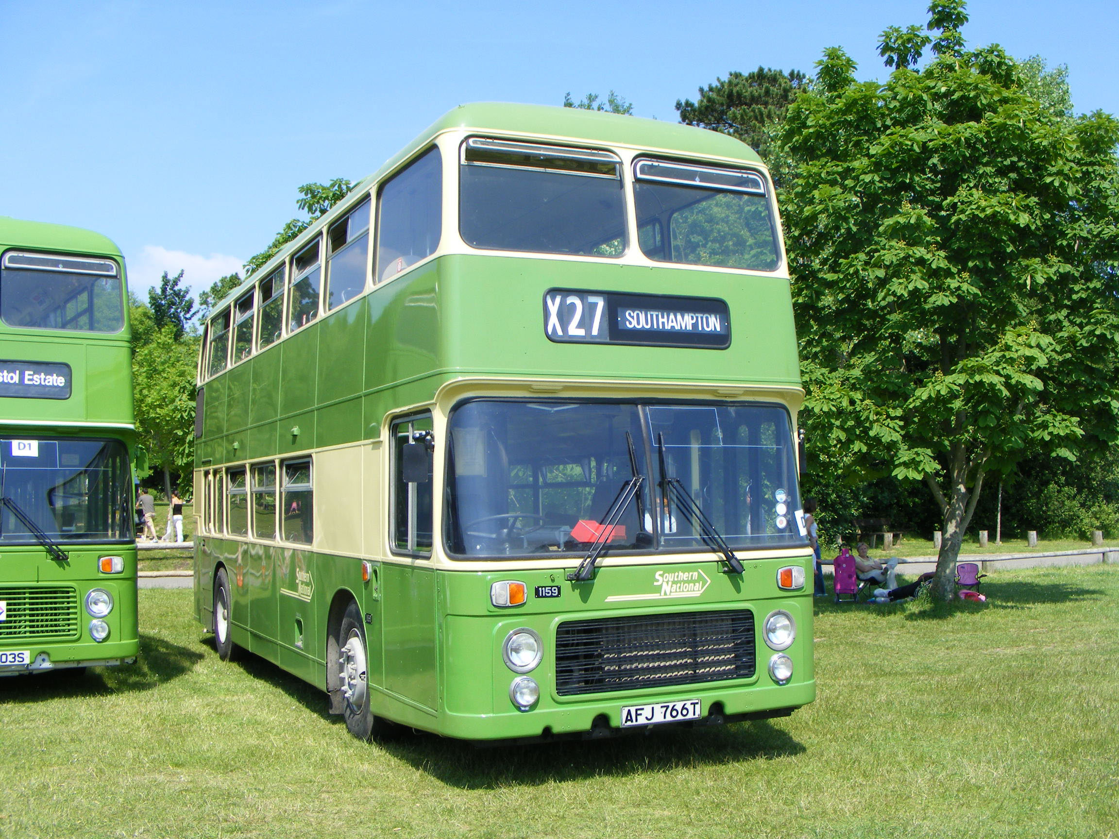 Preserved in Southern National's apple green and cream is VR 1159 (AFJ766T). The bus is seen at the 2008 Netley Park rally.