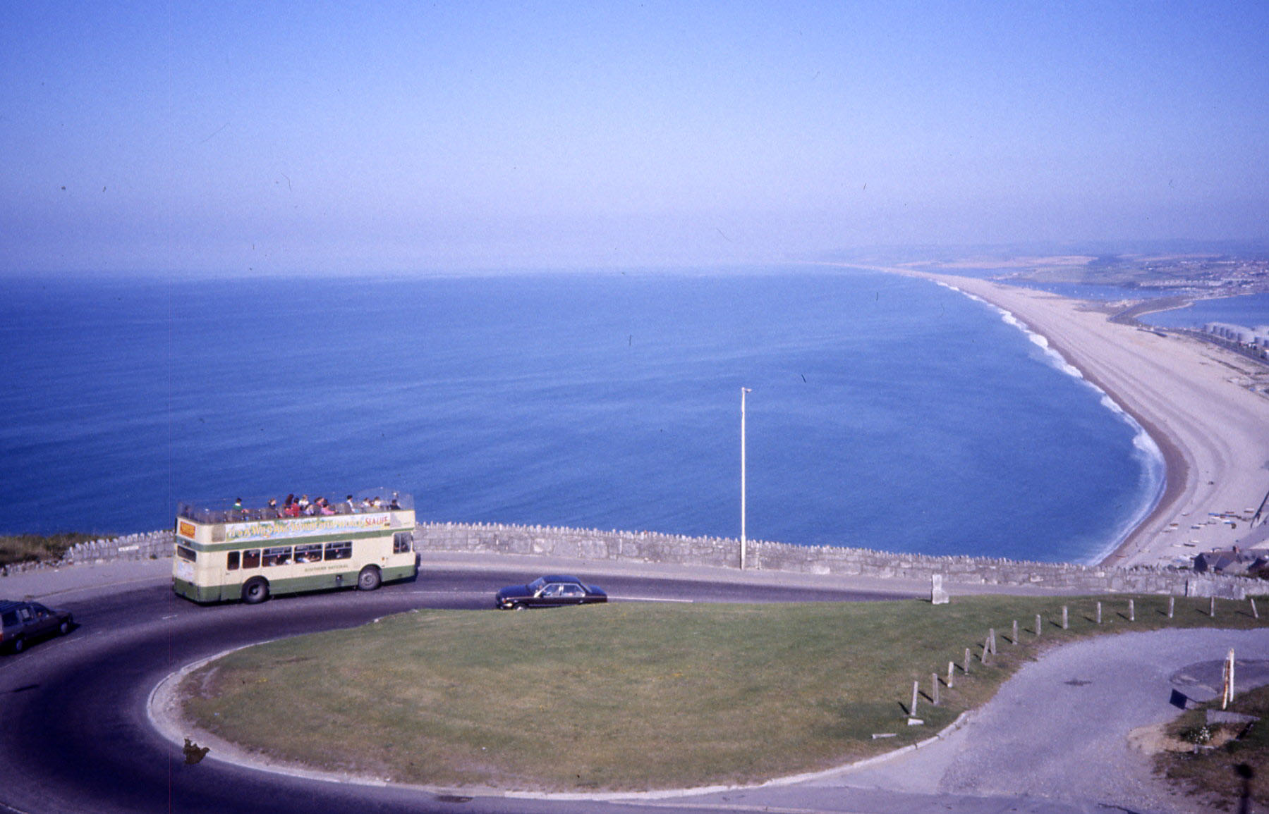 This VR is in more conventional Southern National livery. The company adopted a livery close to that of late lameneted Southdown before SNOC was taken over by First and Barbie colours started to hold sway. The VR is making its way down from Portland to Weymouth to cross the Chesil Beach causeway.