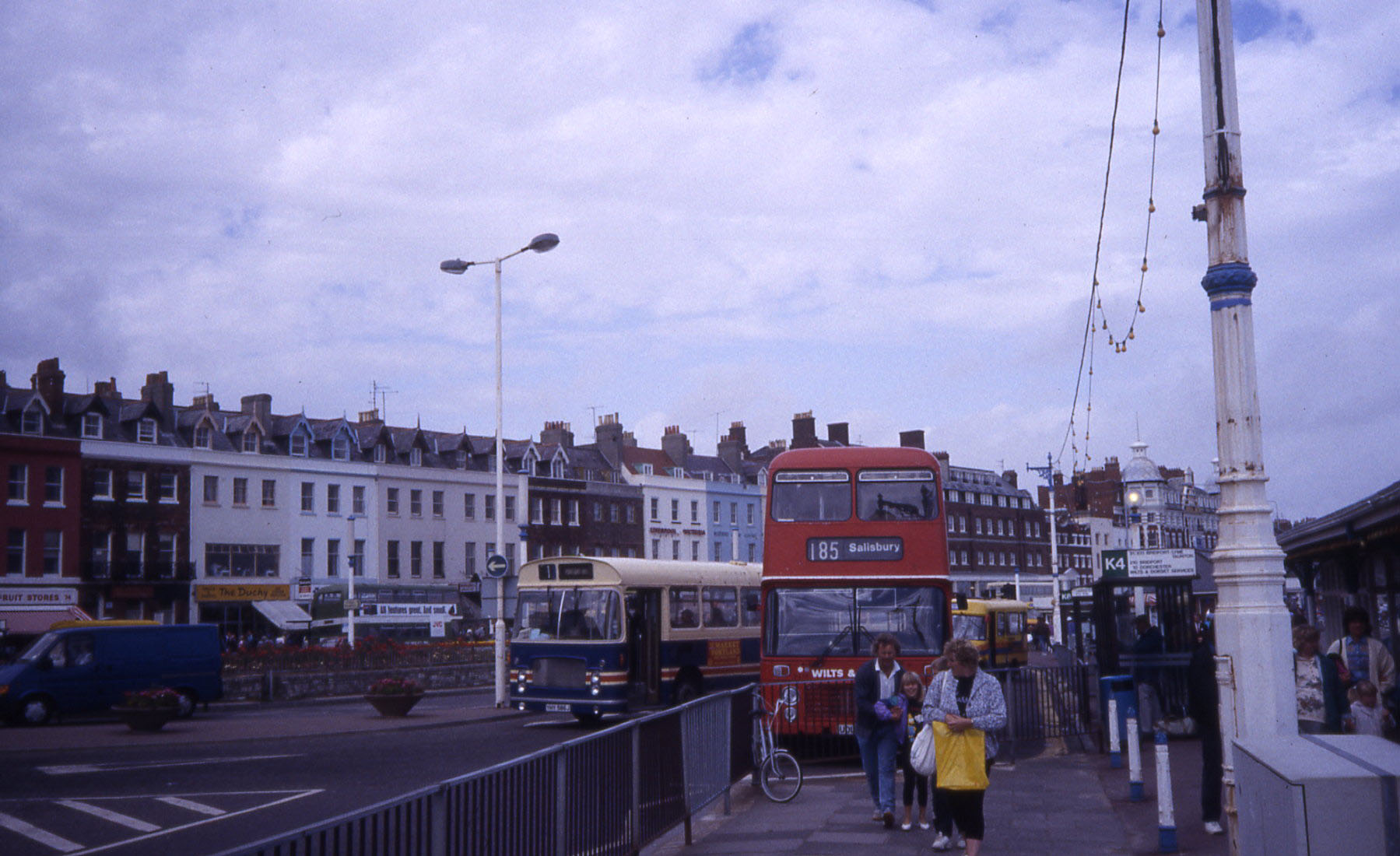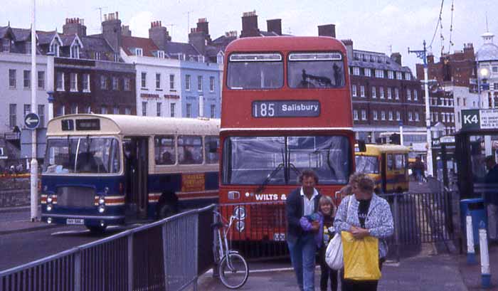 Weymouth's Jubilee Clock has served as a terminus for the town's services for many years. The Wilts & Dorset VR is awaiting departure for Salisbury. Passing by is a Bristol RELL in Western National livery, but used by Smith's competing with Southern National on the Portland service. However this picture was taken shortly after Southern National had taken over Smith's services and vehicles. A Southern National Ford Transit Shuttle is behind the VR.