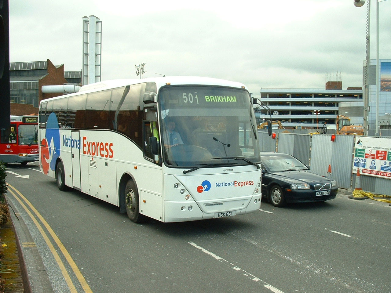 Jonckheere Modulo coachwork is seen on this three month old Volvo B12B, HSK645, of Trathens in June 2005 at Heathrow.