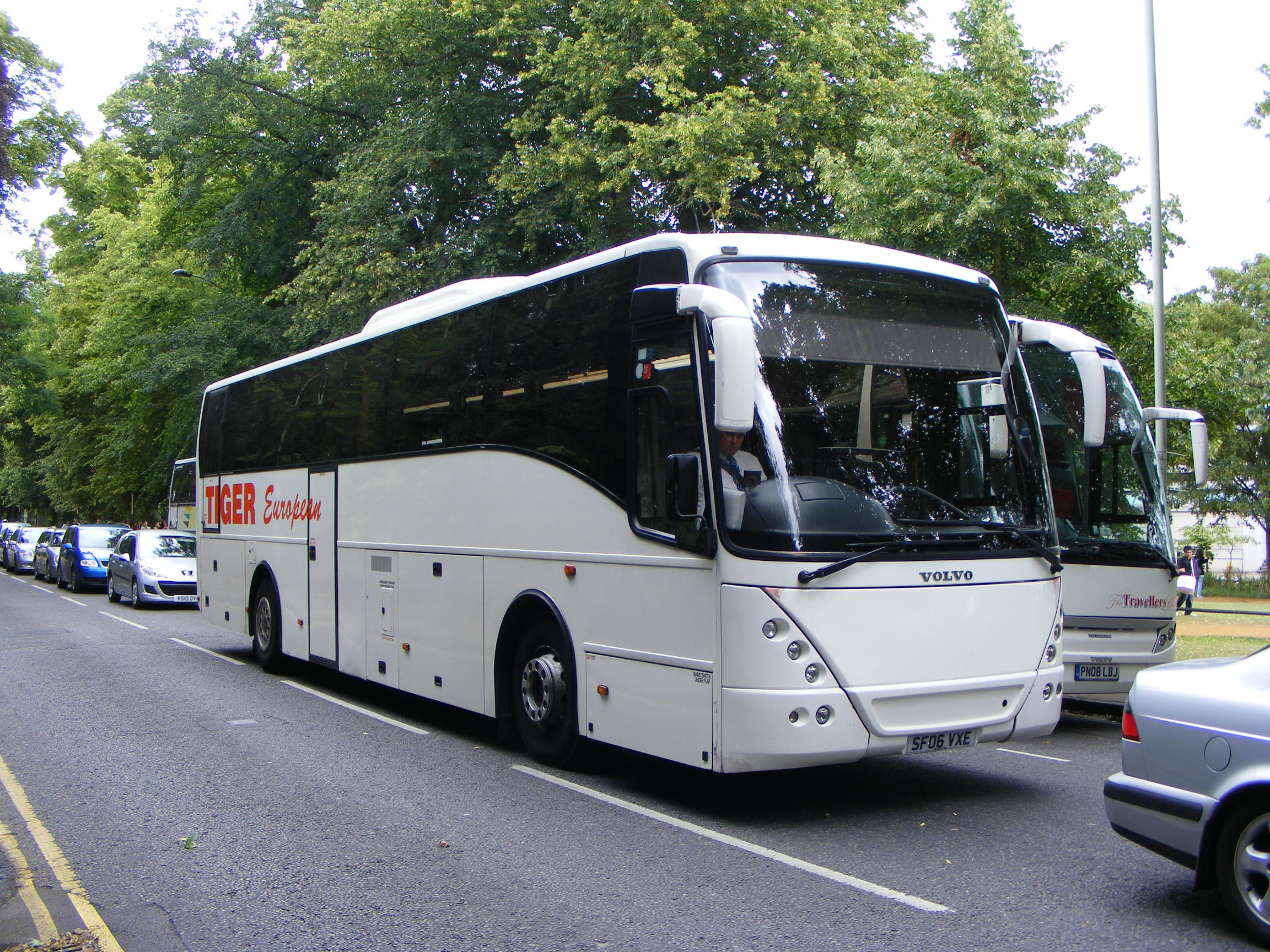 Despite inevitable high mileages Parks-Trathens coaches are in high demand after their relatively short stints on front line service. The SK registrations are recycled and the coaches return to dealers as the year's new intake take over the express duties. This Volvo B12M, now registered by Parks in Scotland as SF06VXE, has joined Nottingham based Tiger European and is seen in Cambridge in July 2011. |