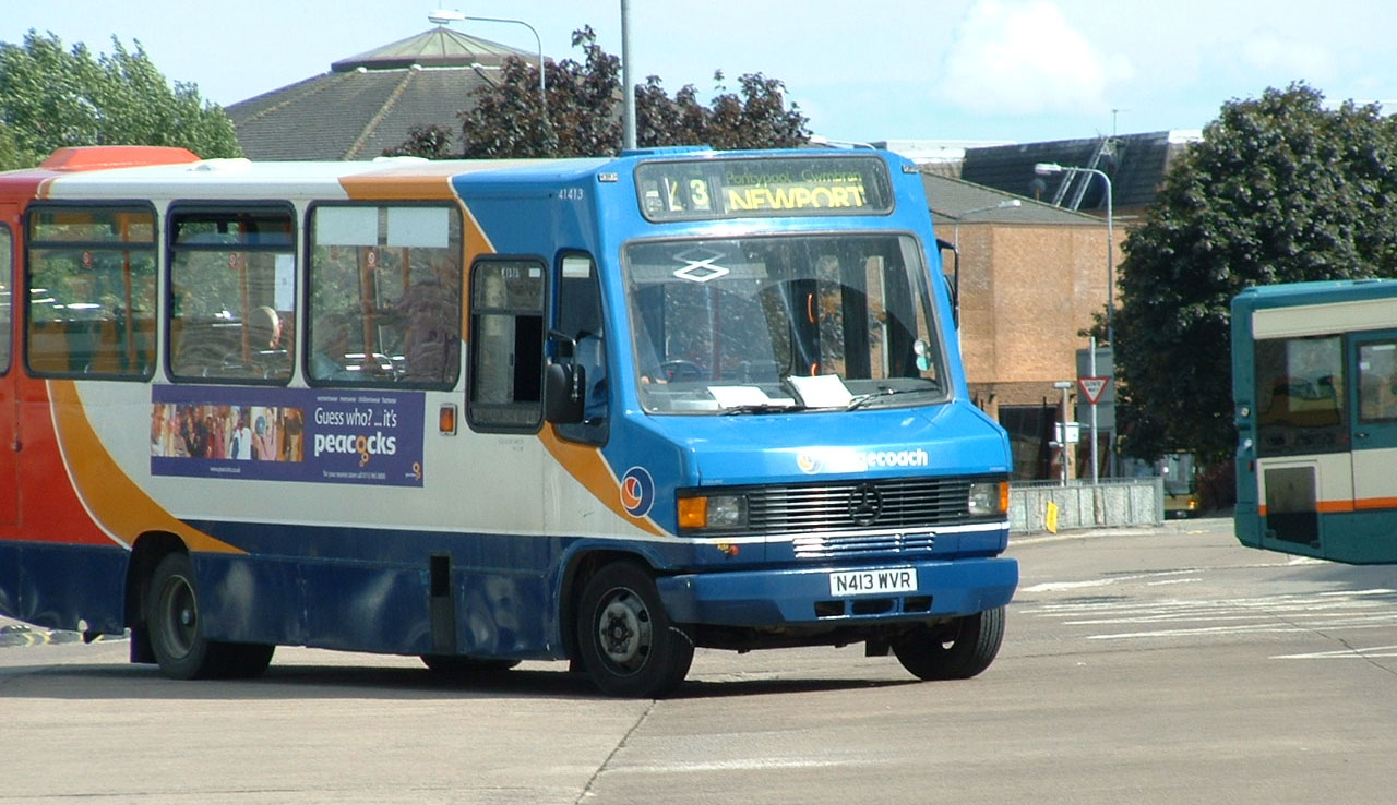 Seen with another B10M in Newport Bus Station in March 2003 is Alexander ALX100 bodied Mercedes O811D 41413 (N413WVR) heading for Blaenavon.