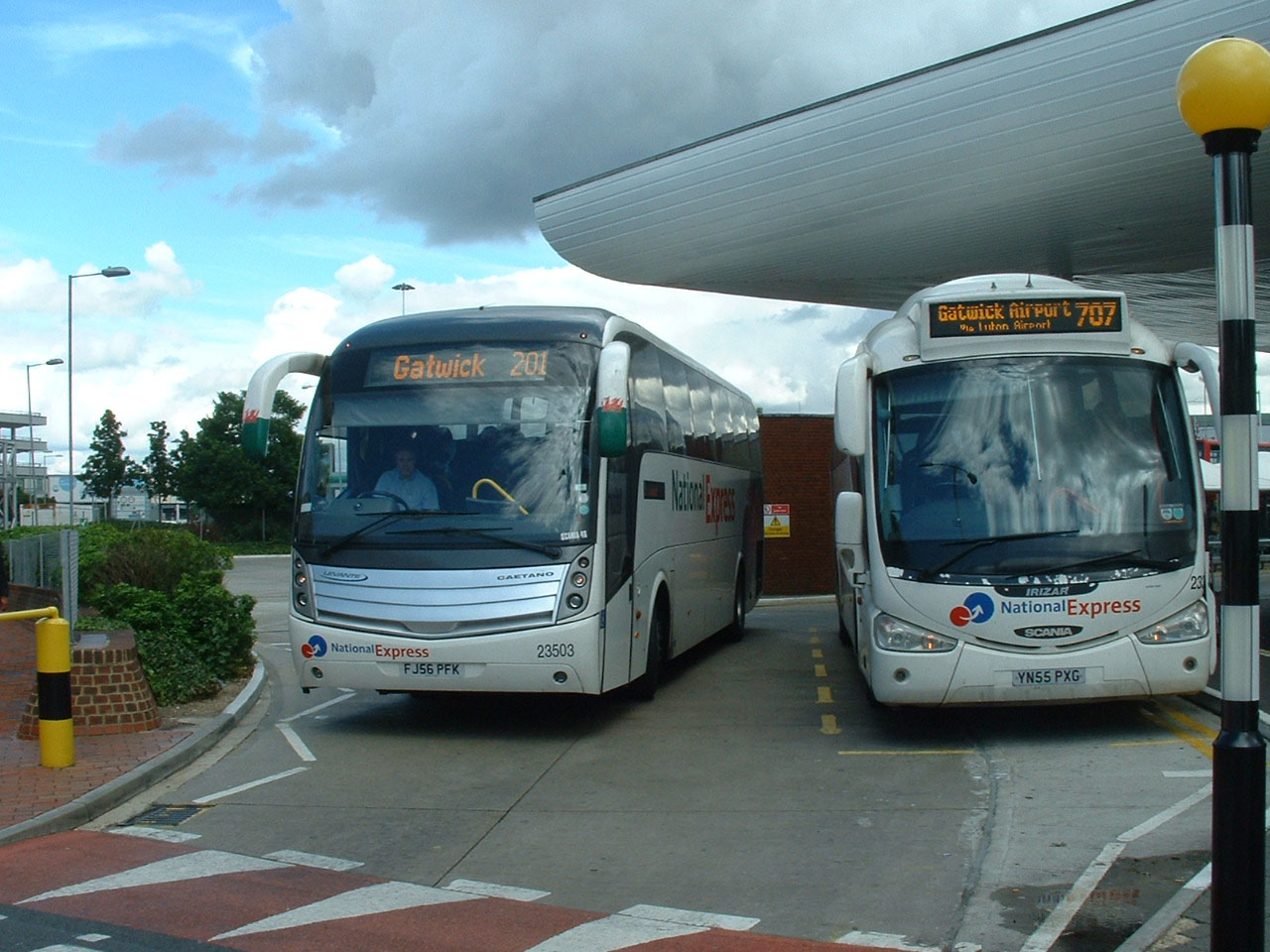Leaving Heathrow in August 2007 is Caetano Levante bodied Scania K340EB 23503 (FJ56PFK) an early recipient of a special Welsh version of National Express livery to celebrate St David's Day. |