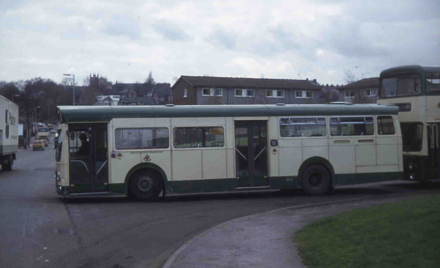 Whether Chesterfield were desperate for large capapcity singledeckers or not, they bought no less than eighteen barely ten year old MCW bodied Panthers, surplus to requirements in Liverpool, from Merseyside PTE in 1977 and 1978. Here a recently acquired example is followed by one of the Roe bodied Fleetlines.