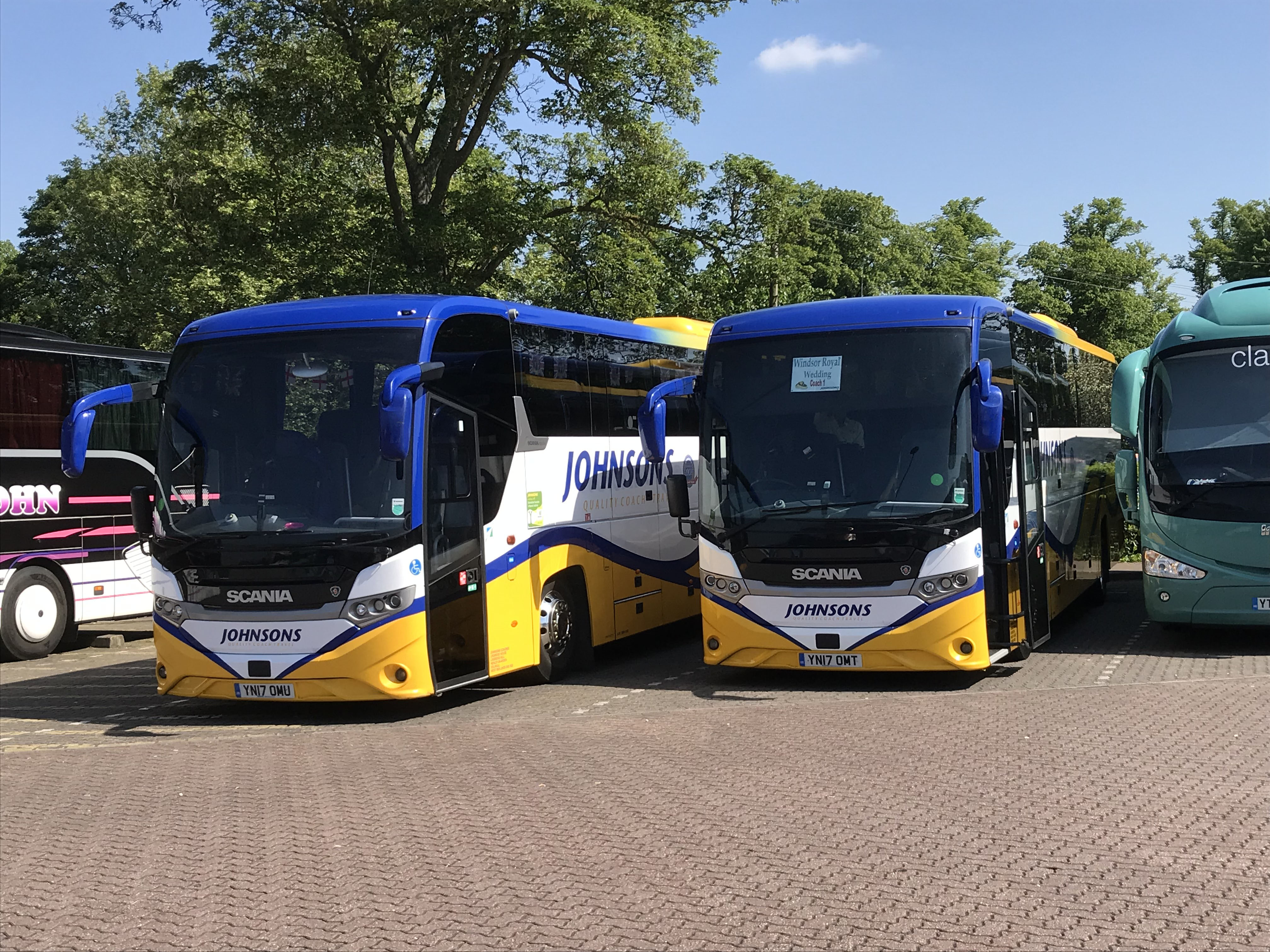 Windsor Coach Park in May 2018 was being visited by this pair of Scania K410EB Interlink coaches, YN17OMU and YN17OMT.