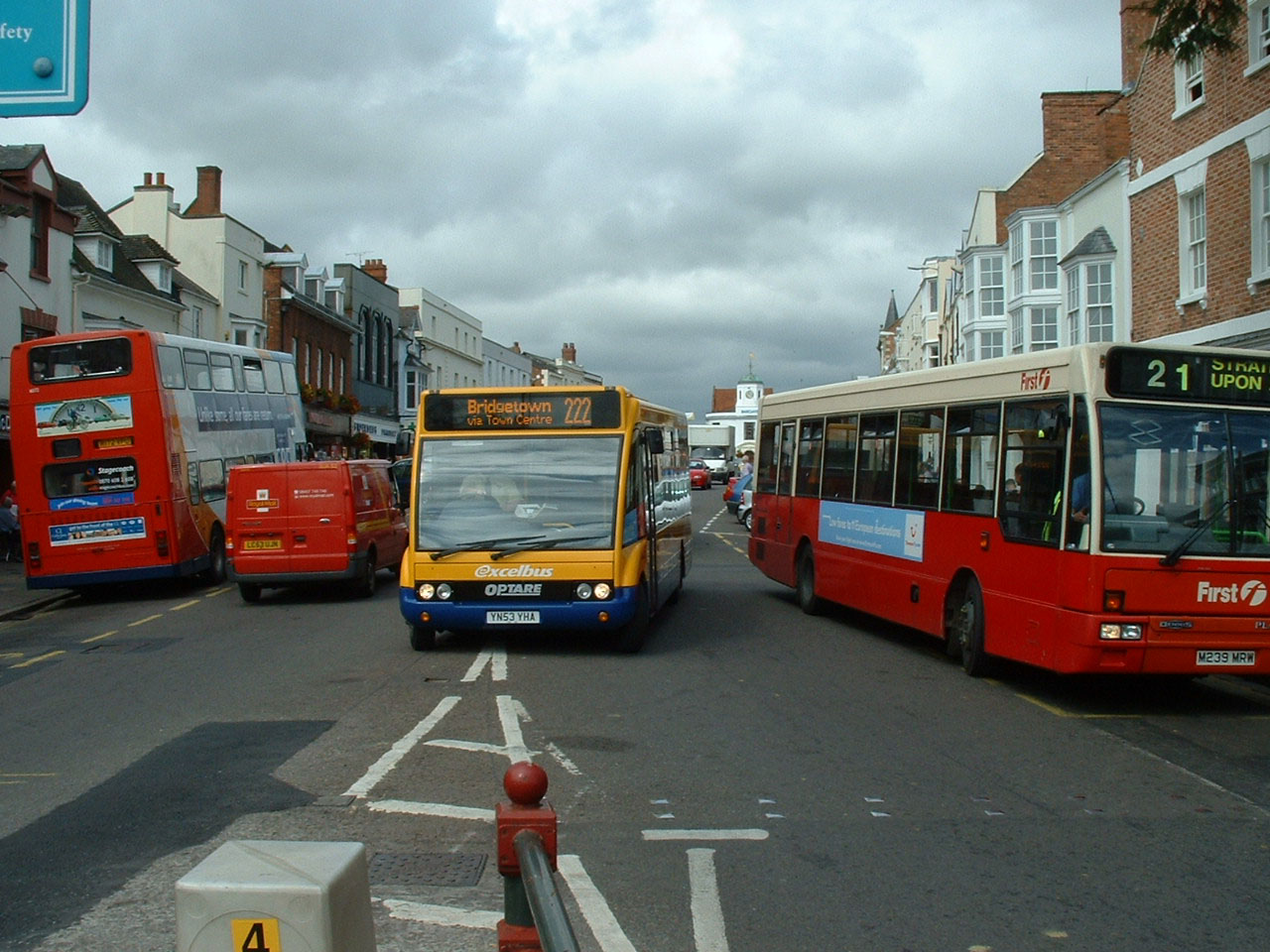Sandwiched between a Stagecoach Midland Red South (Warwickshire) Olympian and a First Midland Red West Dennis Lance is one of Johnson's "excelbus" branded Optare Solos, YN53YHA, on the frequent 222 service from Stratford on Avon to Bridgetown. |
