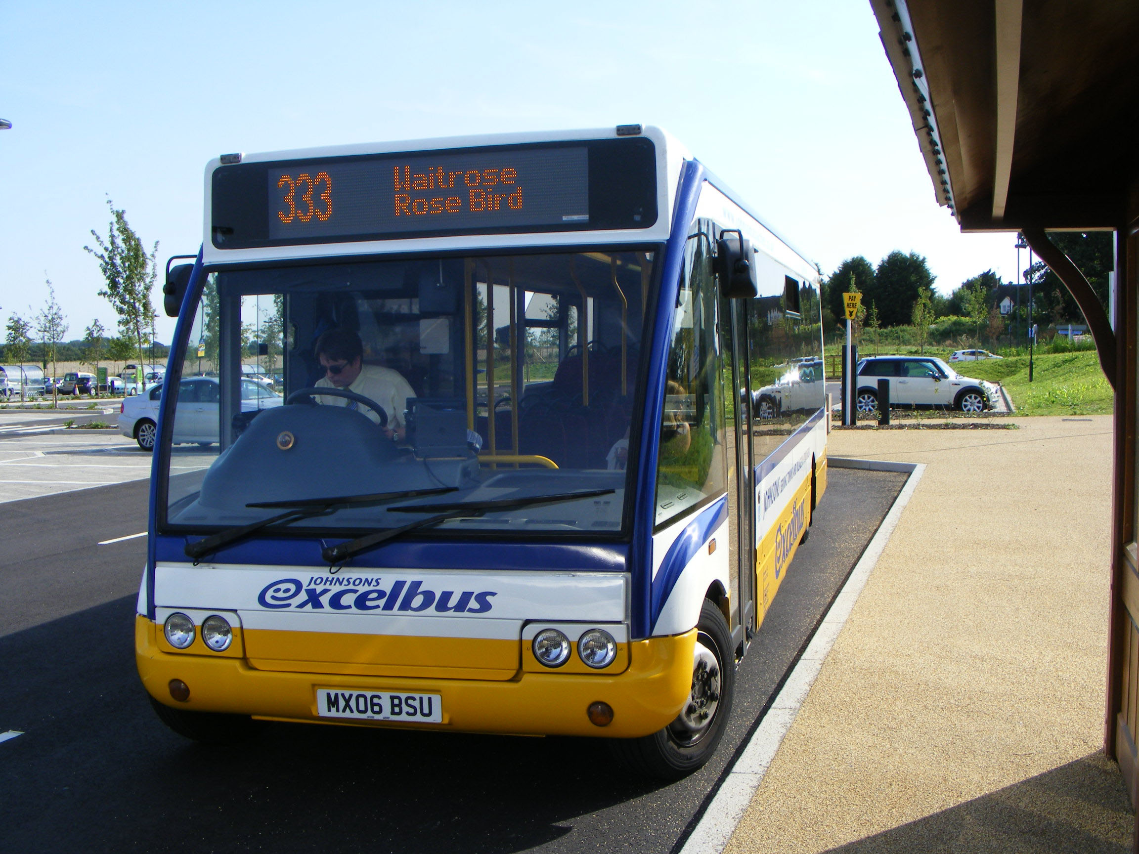 Newer Solos, and other buses, for the expanding Johnsons bus network have kept the "excelbus" branding but adopted the fleet colours of the coach division. Solo MX06BSU is seen at the Waitrose Rose Bird Park & Ride site on the southern edge of Stratford-upon-Avon, not far from the Long Marston Site of SHOWBUS, in September 2012. |