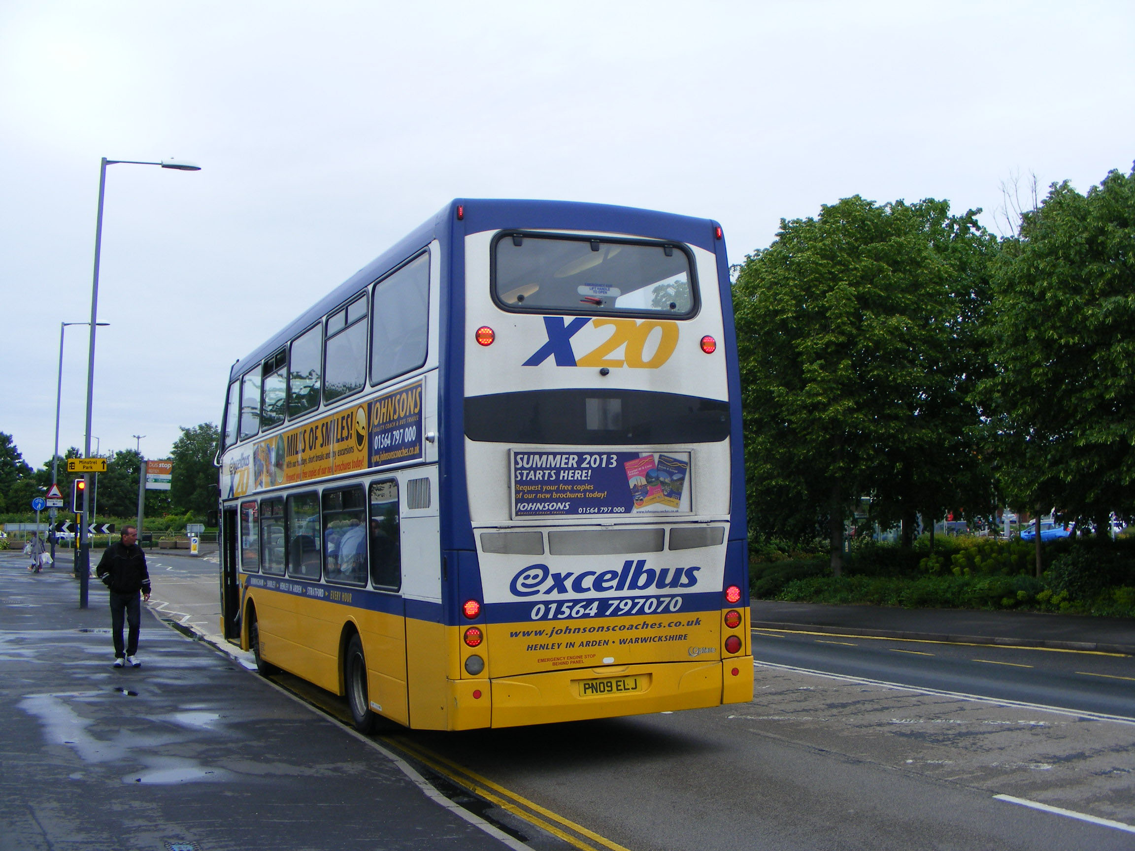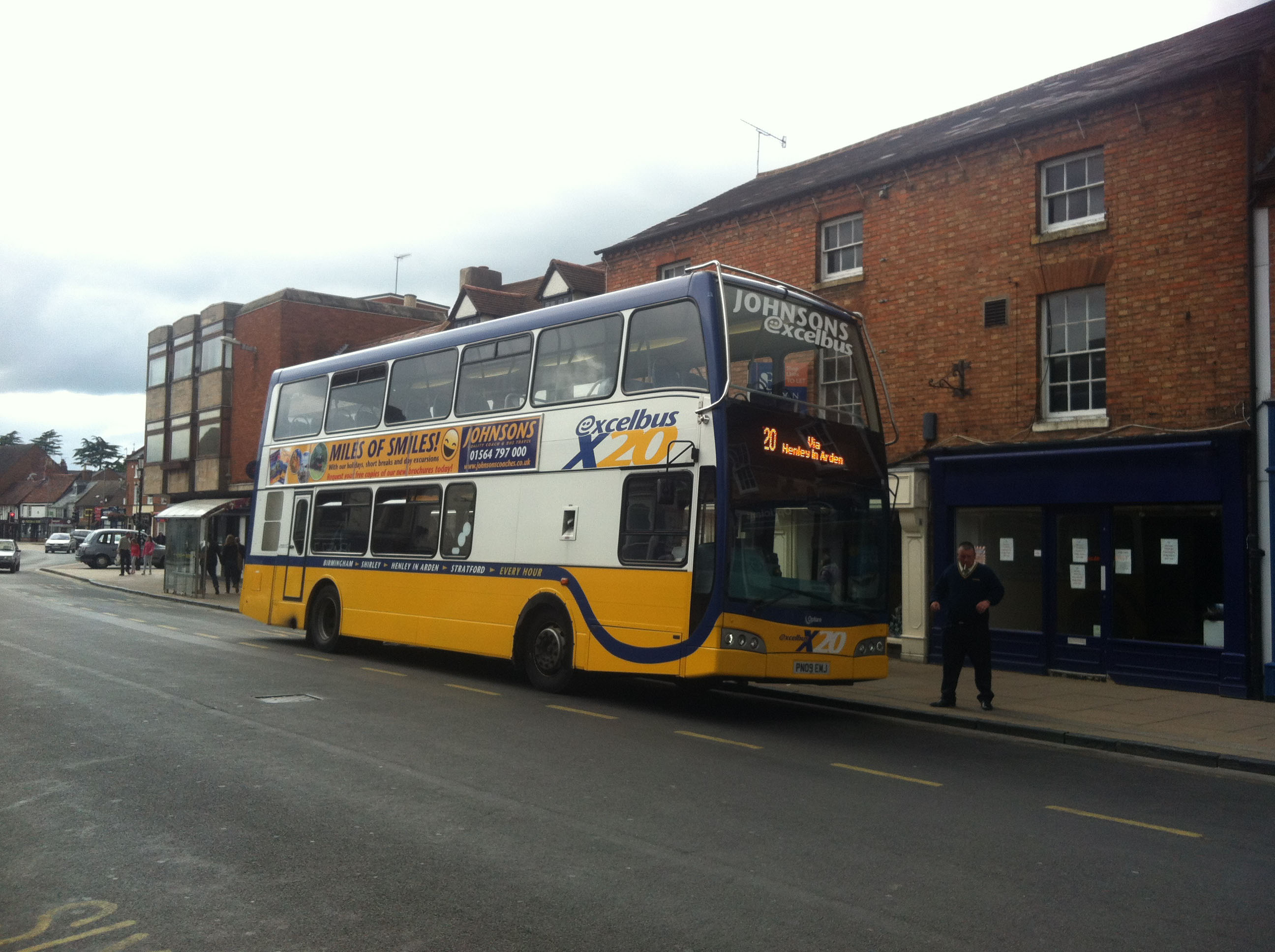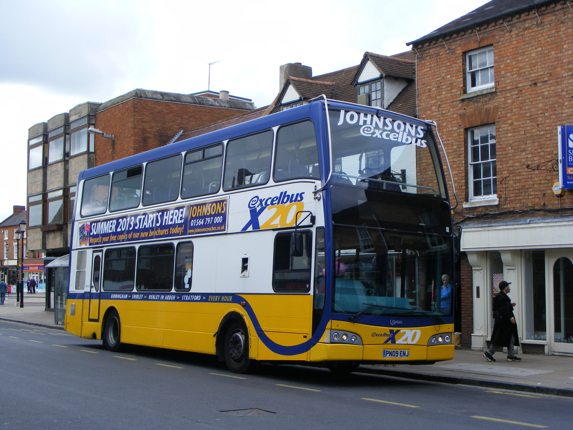 Prior to the stir caused by the hybrids, Johnsons caused more excitement with the purchase of a trio of Scania N230UD doubledeckers for the tendered X20 service linking Birmingham with Stratford-upon-Avon and conveniently passing the company's premises at Henley-in-Arden. Unsurprisingly Johnsons chose Optare to body their new front line buses with the East Lancs Olympus design, PN09ENJ is resting at the Stratford terminus on a Sunday in June 2013. |