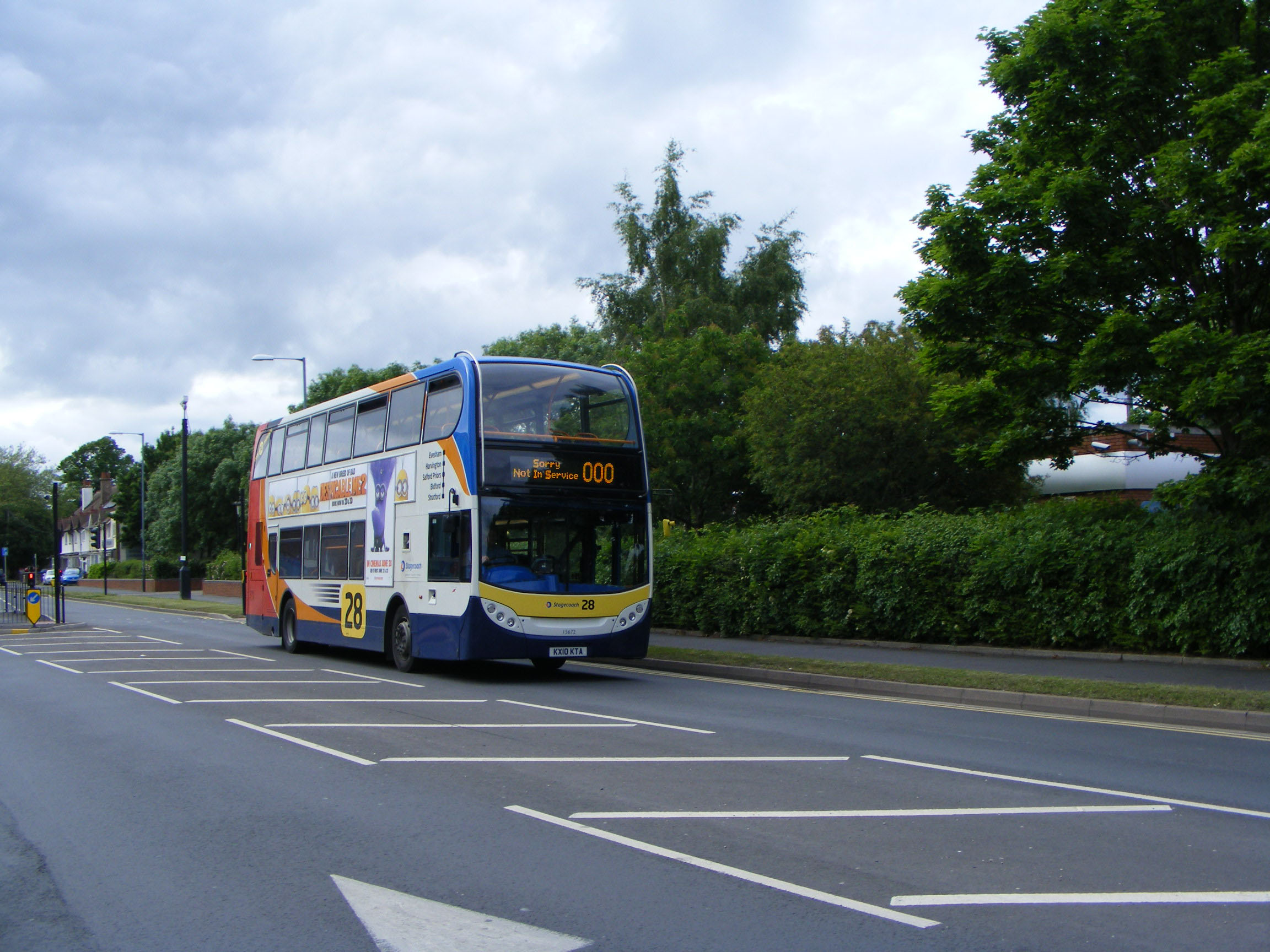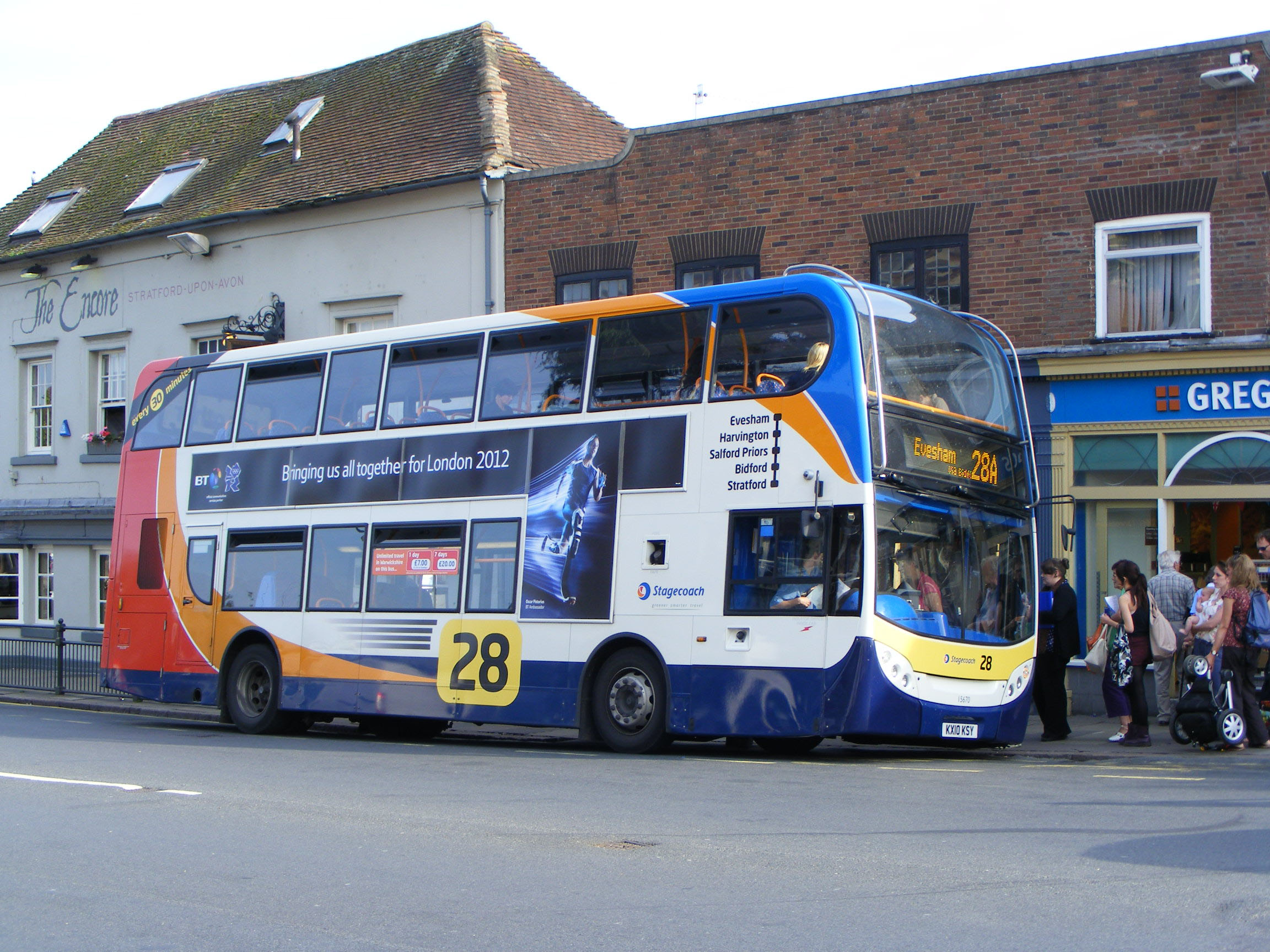 Heading light from the depot to take up service on the 28 from Stratford to Evesham is Scania 15672 (KX10KTA).