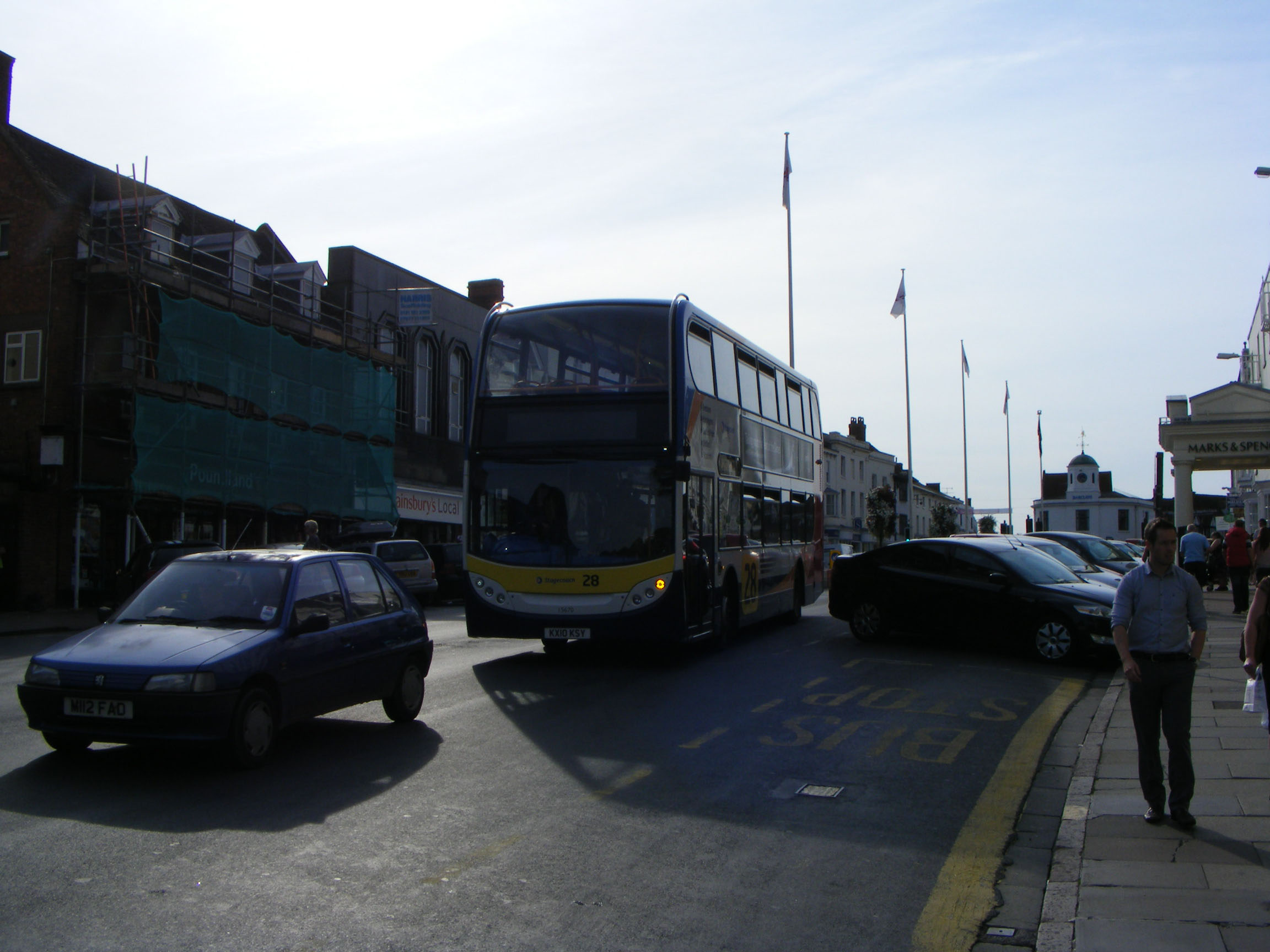 Unbranded Scania N230UD with Alexander Dennis Enviro400 body 15675 (KX10KTE) is seen on the 28A in Stratford's Bridge Street in June 2013.