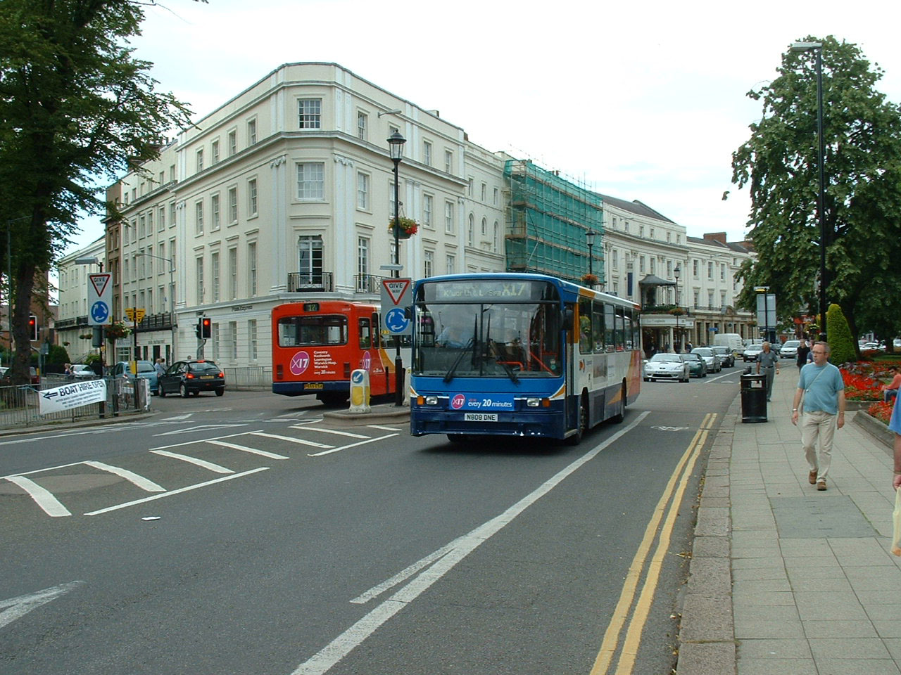 A pair of Alexander PS Volvo B10M buses pass each other route branded for the X17 in Leamington Spa in June 2004. Coming towards the camera is 20808 (N808DNE), originally Stagecoach Manchester 808 and one of the buses in Stagecoach stripes transferred to help update the Midland Red South fleet when it came under Stagecoach ownership. | ![]() |