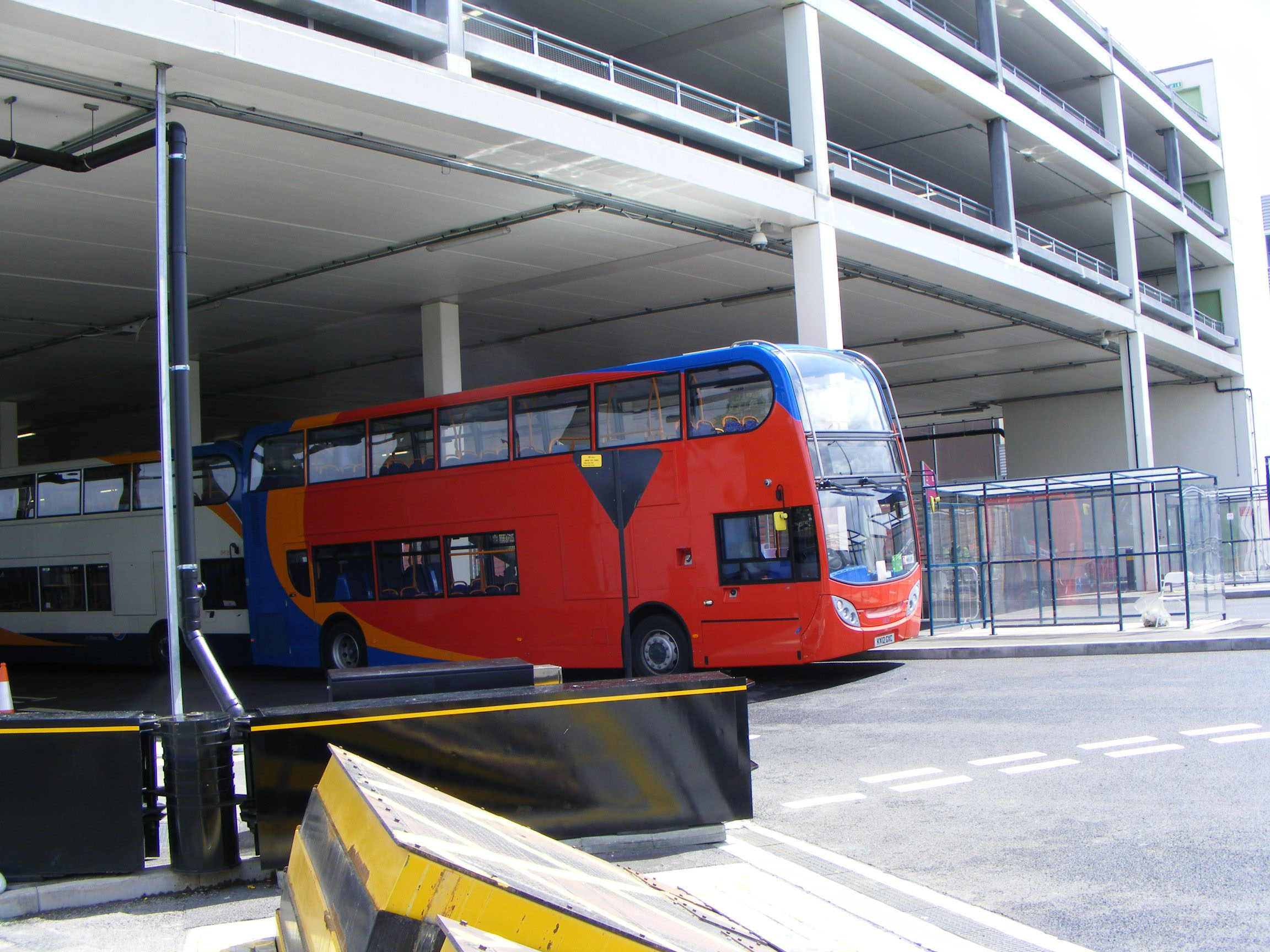The Bus Station under the Westfield Shopping Centre was an exclusive Olympics bus terminus during the games. In the foreground huge rotating metal barriers in the road prevented unauthorised entry. They were about to dip to allow Unibus 10034 (KX12GXC) to exit.
