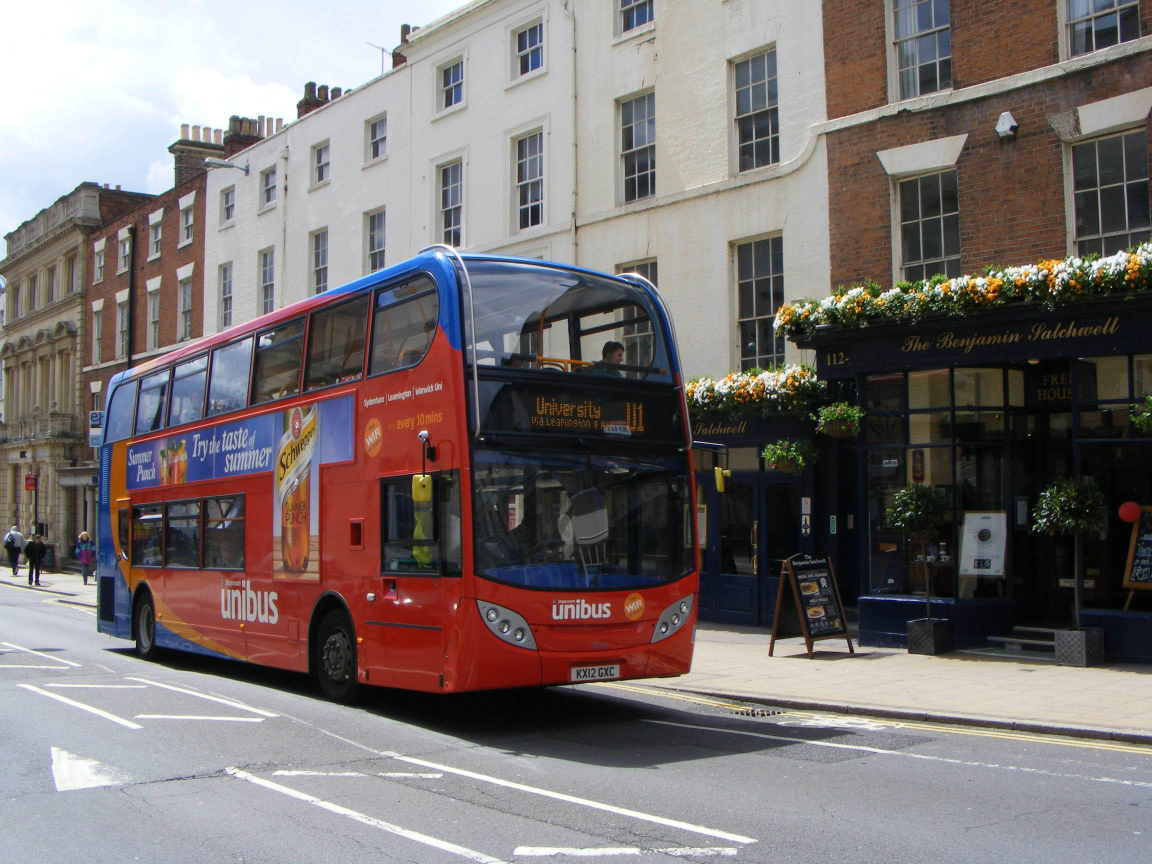 On route 67 County Links liveried Optare Versa 25240 (YJ09EZN) passes Unibus liveried ADL Enviro400 10032 (KX12GXA) in the centre of Leamington in May 2013.