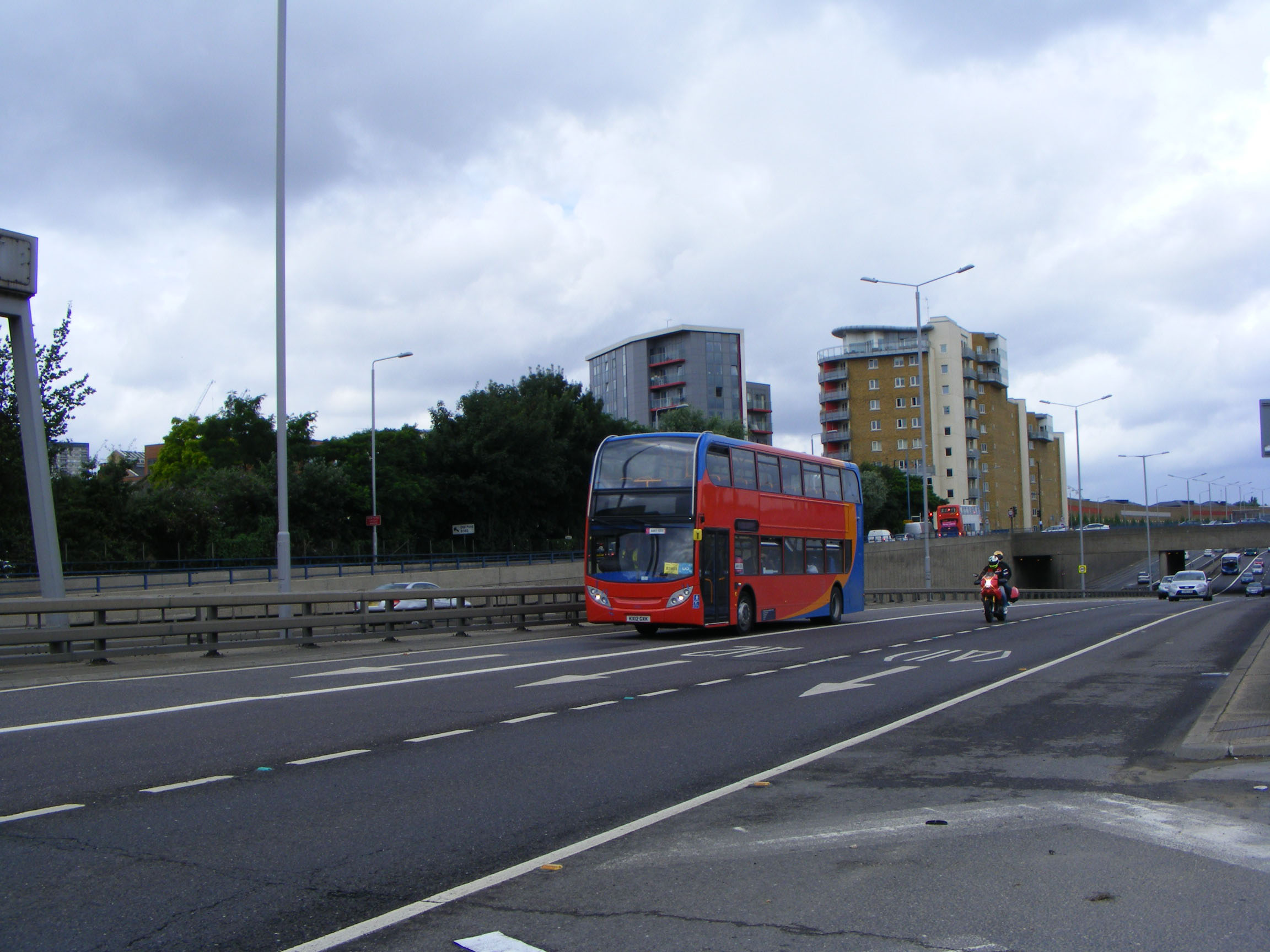Another of the batch 10041 (KX12GXX) is seen bombing down the A12 from the Olympic Park. A corporate liveried Enviro400 from another subsidiary is seen heading up the off ramp.