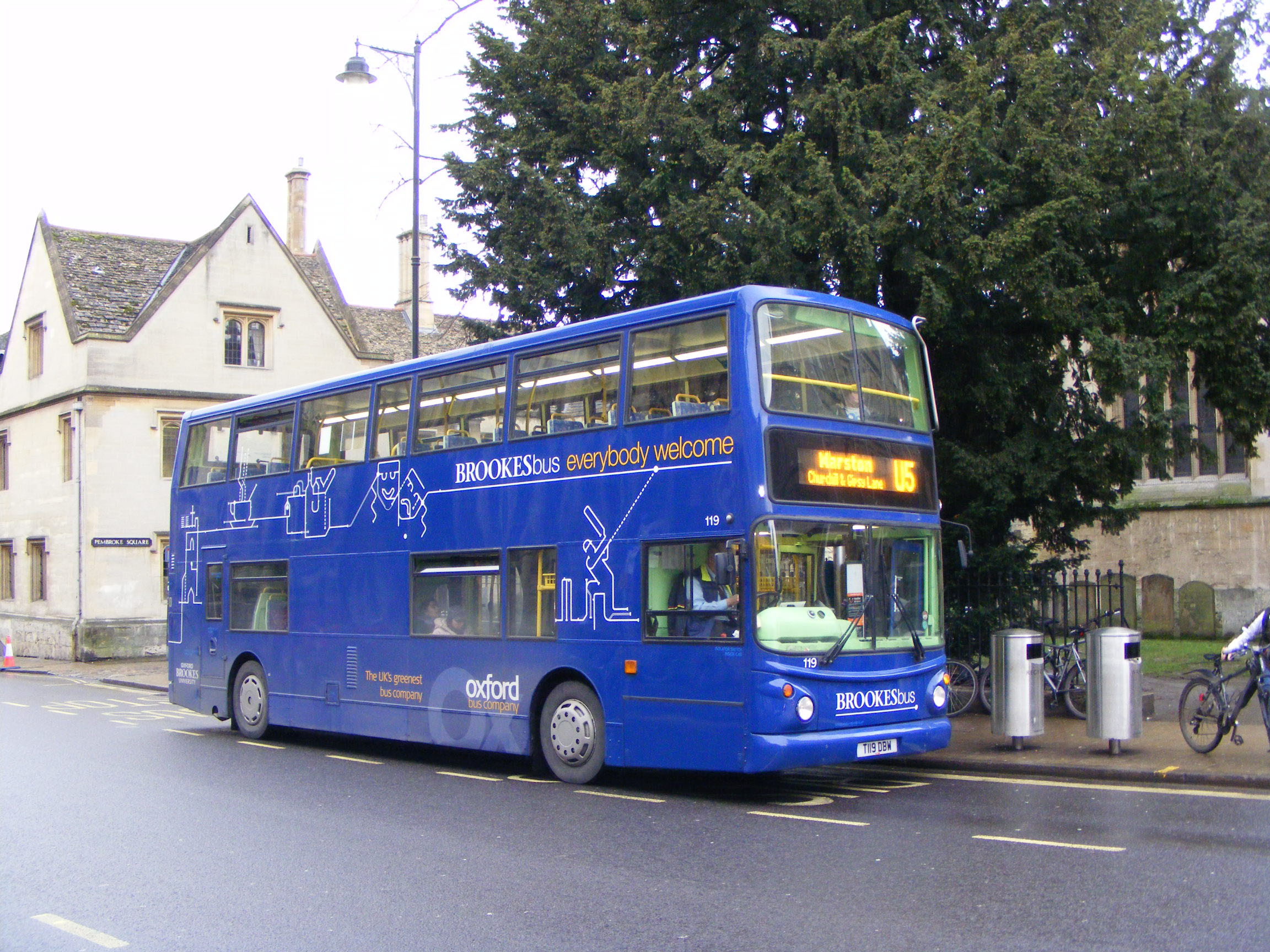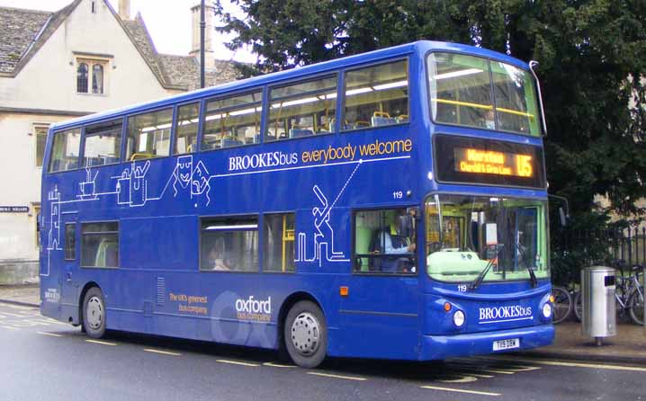 At least one of the Alexander ALX400 batch of original Park & Ride Dennis Tridents was painted in Brookes livery as exemplified by 119 (T119DBW) seen in the city on the U5 in February 2011. Completing the trio, the Tridents have been in green, red and blue!