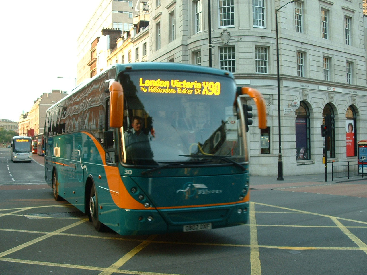 Volvo B10M 10 (R10OXF) heading for the capital on the M40 at Handy Cross, High Wycombe.