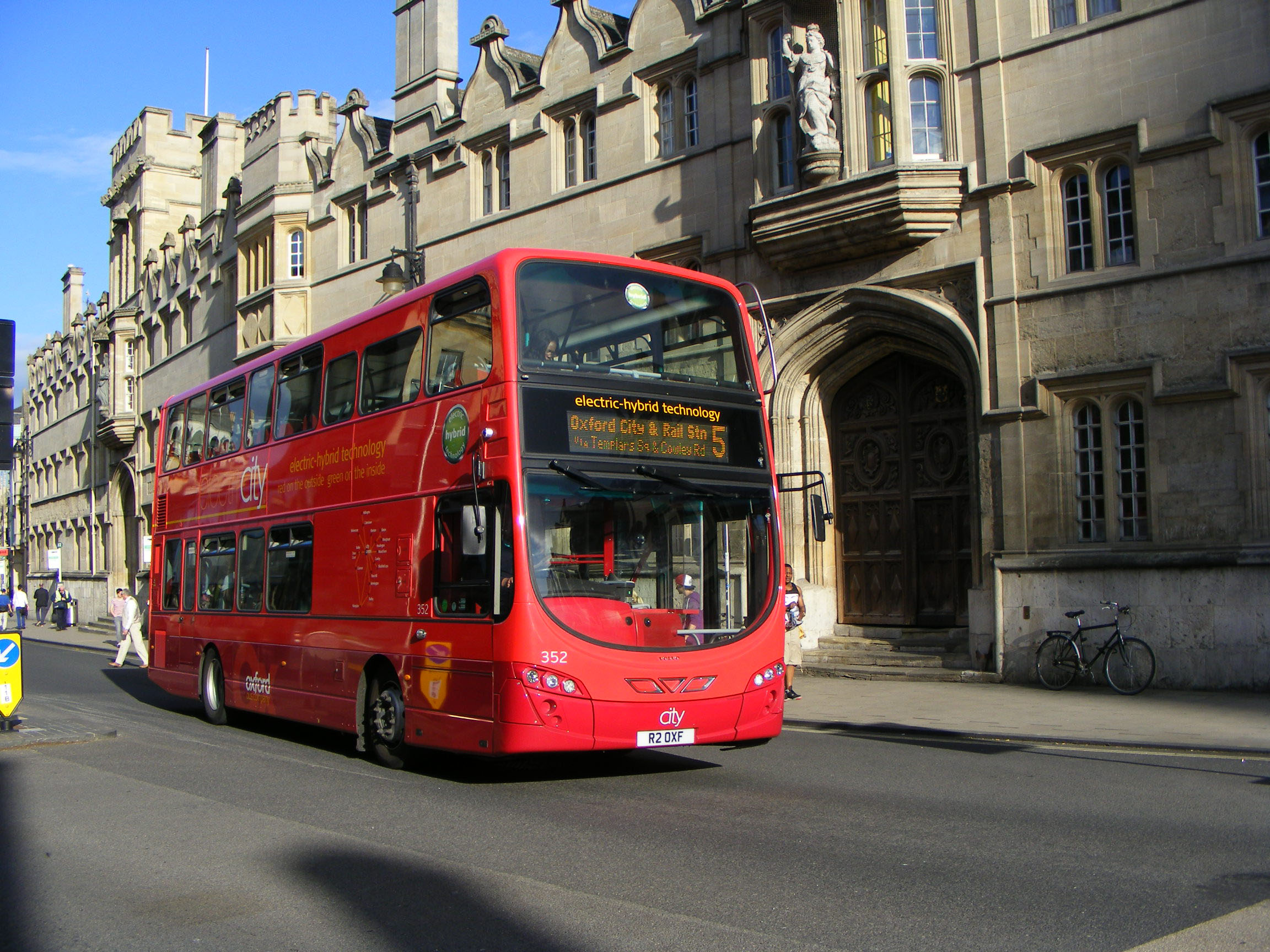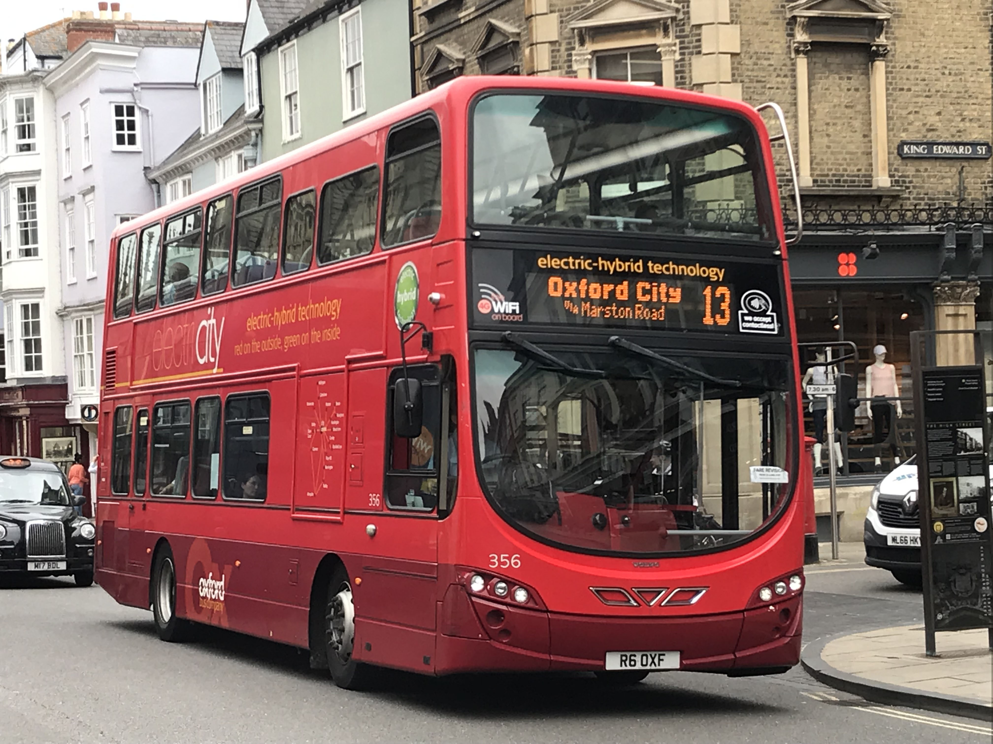 In 2013 Oxford abandoned Scania and Alexander Dennis, turning to Volvo for their hybrid B5LH modesl, bodied with lowheight Wright coachwork. Volvo 352 (R2OXF) is seen in the city in June that year.