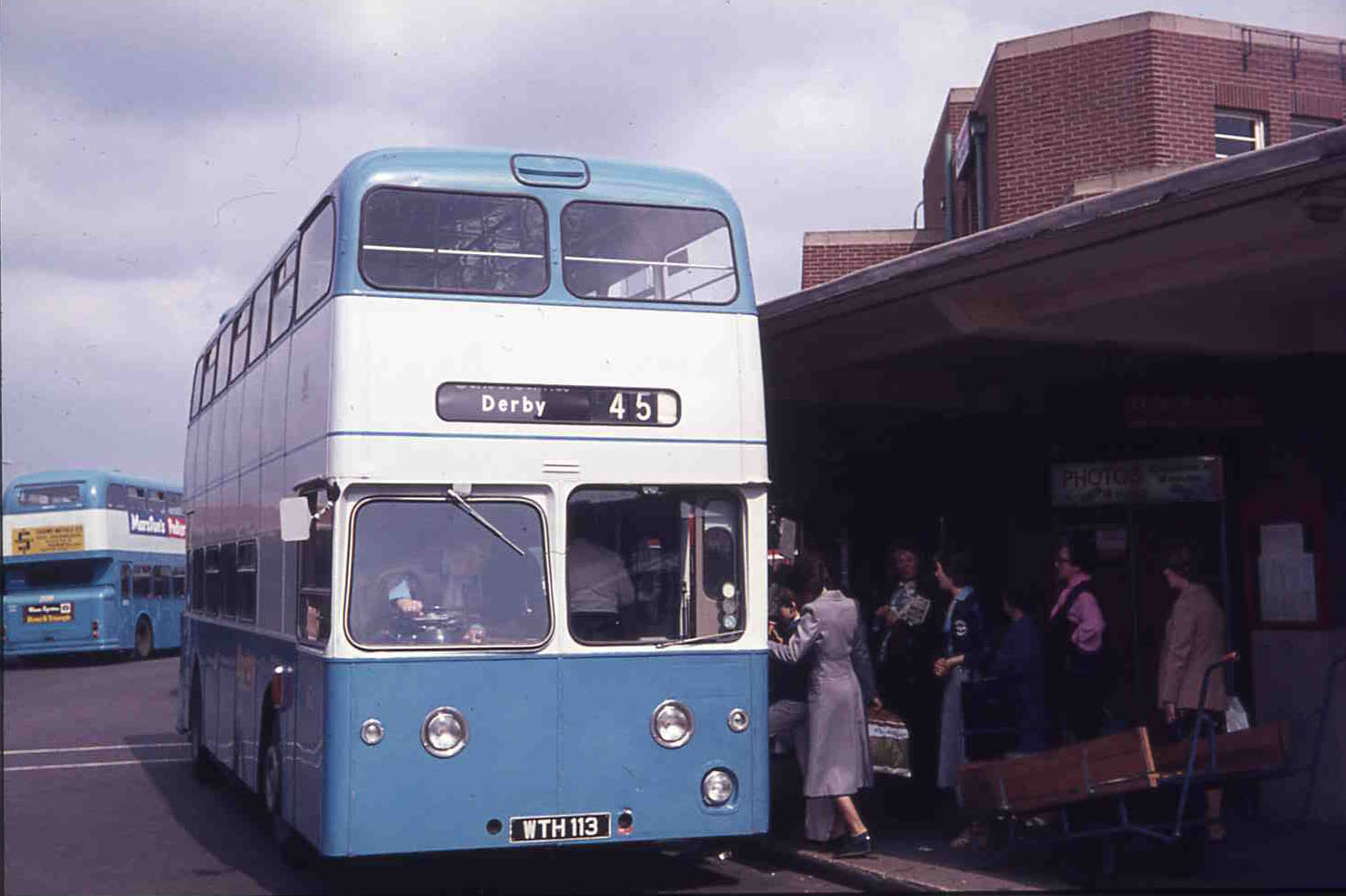 At the since replaced Derby Bus Station, Weymann lowbridge Derby Leyland Atlantean 62 (WTH113) is loading on route 45, though the driver has yet to change the blind. It was new to James of Ammanford in 1960 as their 237, passing to South Wales the following year, when they acquired James, as their 1237 later joining City of Oxford as 206 before finally making it to Derby.