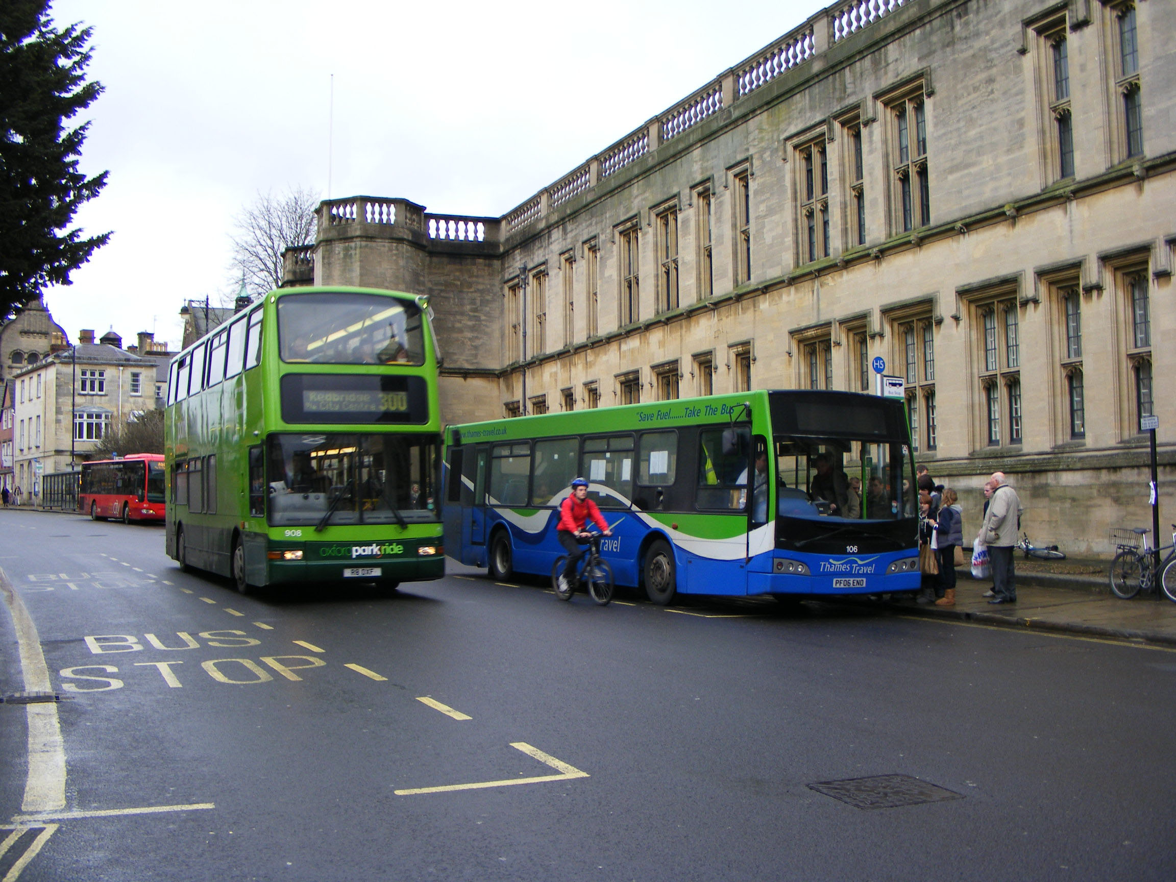 Another Plaxton President bodied Dennis Trident, Oxford Park & Ride 908 (R8OXF), is seen in February 2011 overtaking 106 (PF06ENO), another Scania N94UB with East Lancs Esteem body. The Trident was originally Northern 3894 (NK51UCX). |