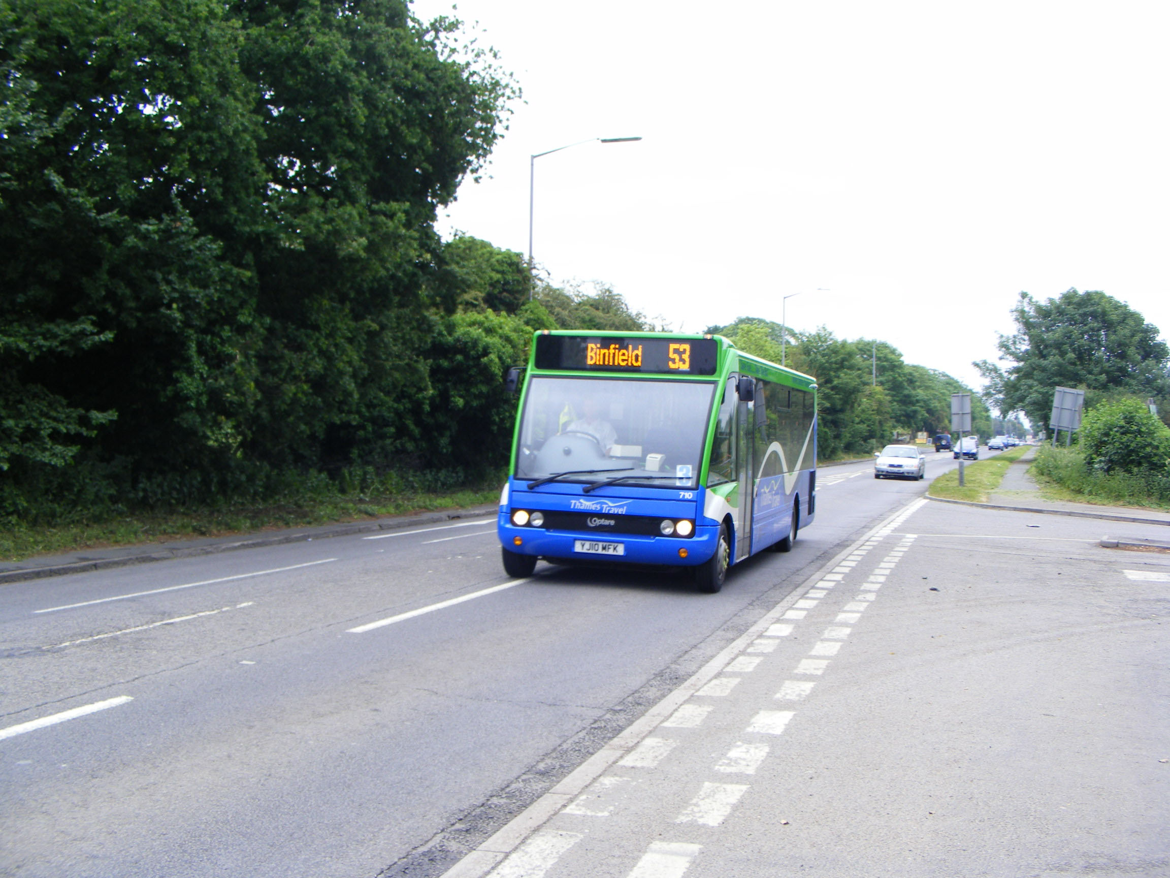 Seen in Bracknell Bus Station in June 2013 was Optare Solo 710 (MX08MYY) new to Britannia Parking in Bournemouth. The bus was transferred to Carousel in 2014. Note this is a different 710, unlike YJ10MFK the fleet number does not represent the seventh (7-) bus purchased in 2010 (-10), it is numbered between 610 and 810. This 710 is numbered between 709 and 711 in the chronological scheme introduced under Go-Ahead within Oxford's historic scheme. The bus thus retained the number 710 when transferred to Carousel. |