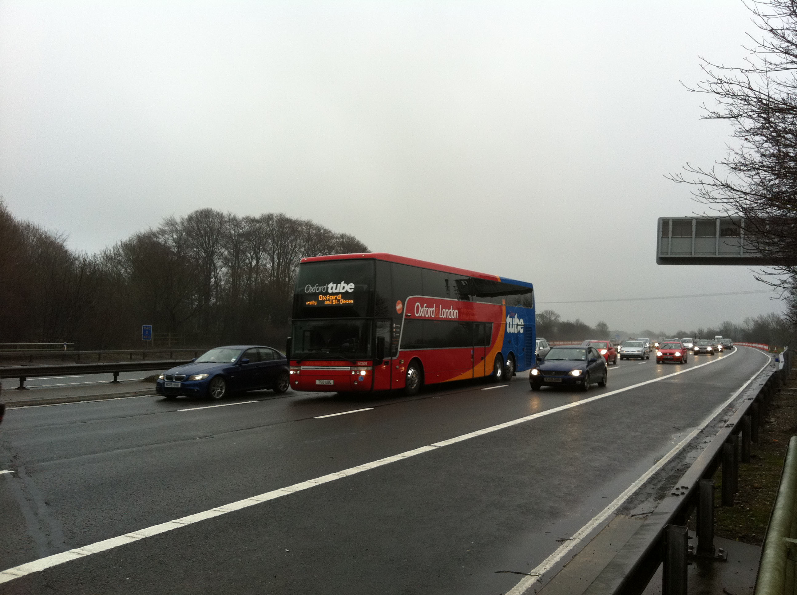 New for the Oxford Tube in 2009 was a fleet Van Hool Astromega TD927 doubledeck luxury coaches, a far cry from the Mercedes minibuses once used. Seen here on the M40 in April 2011 is 50216 (OU59AVC), one of the fleet of 26 which displaced the Neoplans after five years loyal service.
