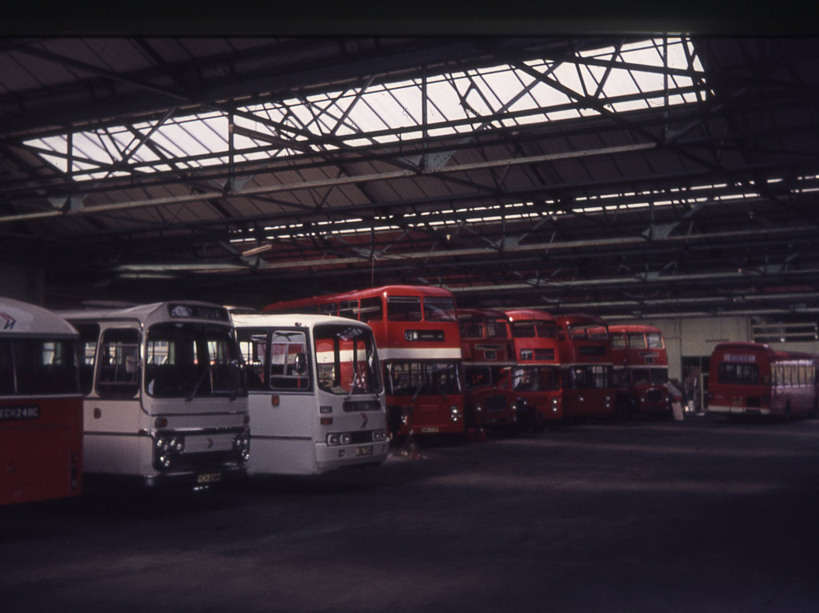 In the mirk of the Derby depot in early NBC days are two standard Trent Fleetline/Alexanders with an NBC liveried new Bristol VRTSL6G.