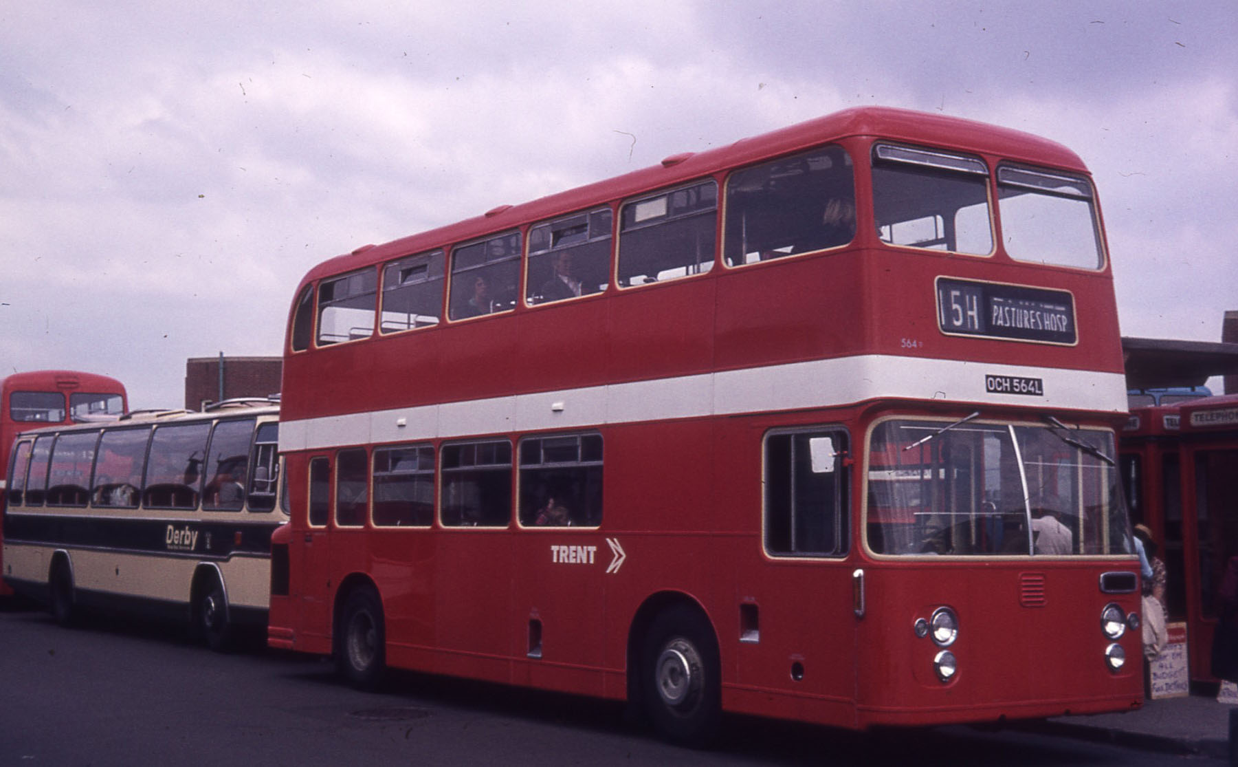 ECW bodied Daimler Fleetlines were something of a novelty, but NBC had several in the early seventies with Trent taking a batch to run alongside their Alexander bodied examples. Here is 564 (OCH564L) in Derby Bus Station with the Derby City fleet's Plaxton Supreme coach behind. |