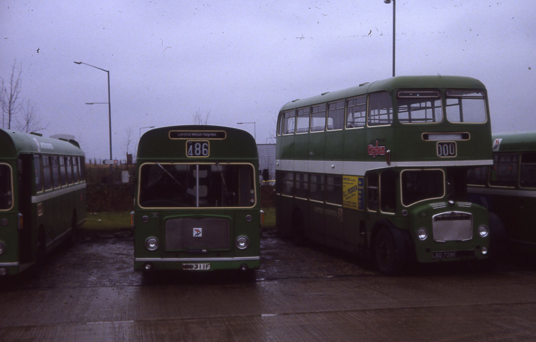 Seen at the now closed Bletchley bus depot, adjacent to the Bus Station is Lodekka 728 (LBD728E) with Milton Keynes Citybus branding alongside flat front ECW bodied Bristol RELL6G 311 (NBD311F), now preserved.