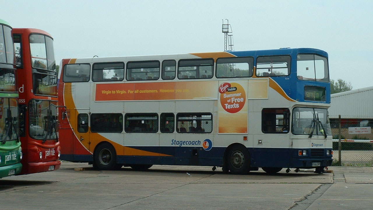 Another Olympian disposed of to Cambridgeshire was 16566 (R566DRP) seen in the Cambridge yard of Stagecoach Cambus, in the company of Park & Ride liveried Dennis Tridents in summer 2006. |