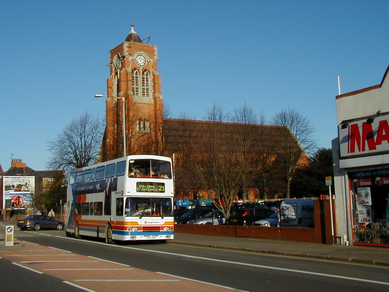 Alexander bodied Volvo Olympian 753 (S753DRP) is seen near First Northampton's depot on a sunny Sunday in late 2003.
